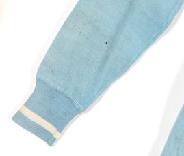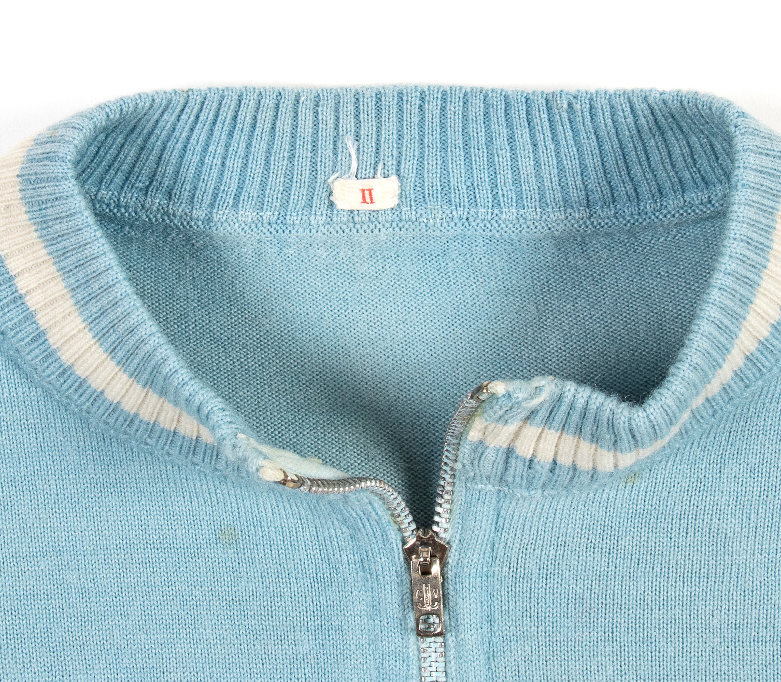 Maglia a maniche lunghe, color celeste e fascia centrale bianca, con chiusura a zip al collo.