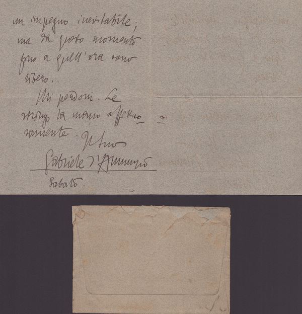Lettera al senatore Annaratone, un foglio, quattro facciate con due facciate scritte a mano, e firma autografa. Con busta indirizzata al " Senatore Annaratone - Palazzo Riccardi - da parte di  Gabriele d'Annunzio (con risposta) " dove il Vate invita il Senatore ad incontrarlo per discutere di alcune faccende riguardanti il suo amico Adolfo Re Riccardi, impresario teatrale. Angelo Annaratone (Frascarolo, 23 agosto 1844 – Roma, 21 agosto 1922) fu garibaldino combatté a monte Suello e contro Carmine Crocco nel Sud. Fu poi prefetto di Brescia, Livorno, Firenze e Roma e nel 1905 salì al Senato. Lettera con motto PER NON DORMIRE , piega centrale, la facciata misura cm.17x13,5
