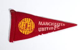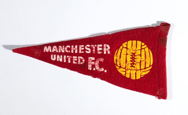 Piccola fiamma in feltro rosso con impresso il logo MANCHESTER Football Club, presumibilmente anni '950, misura circa cm.18 di lunghezza