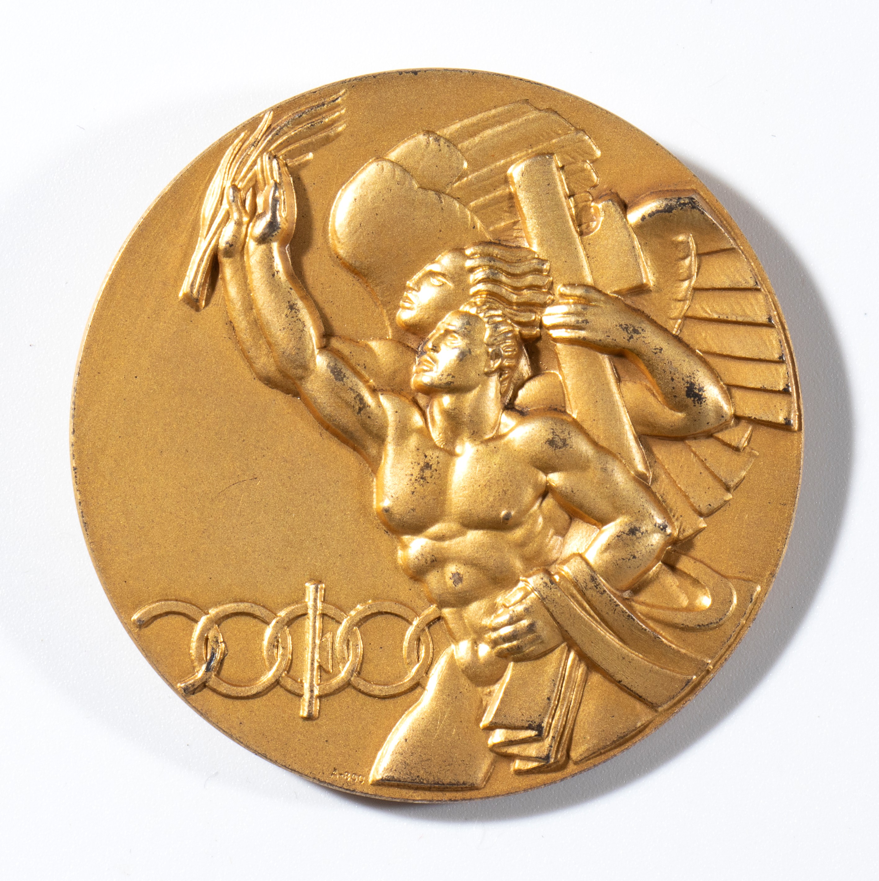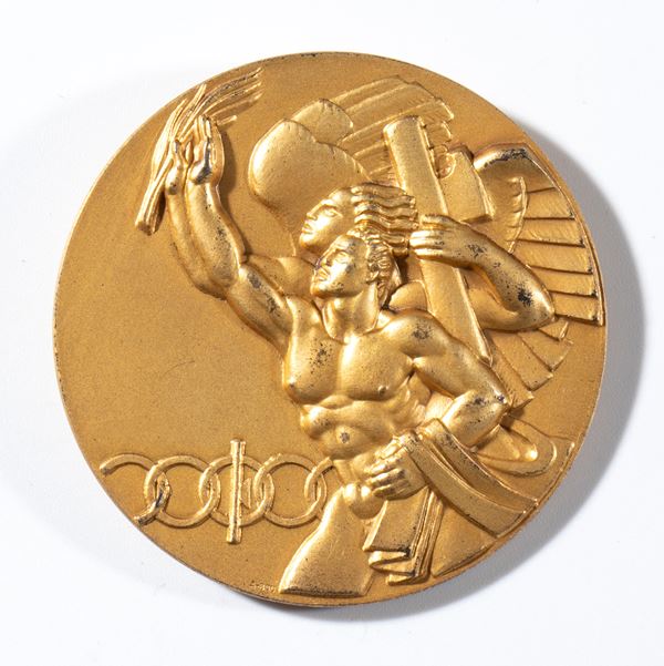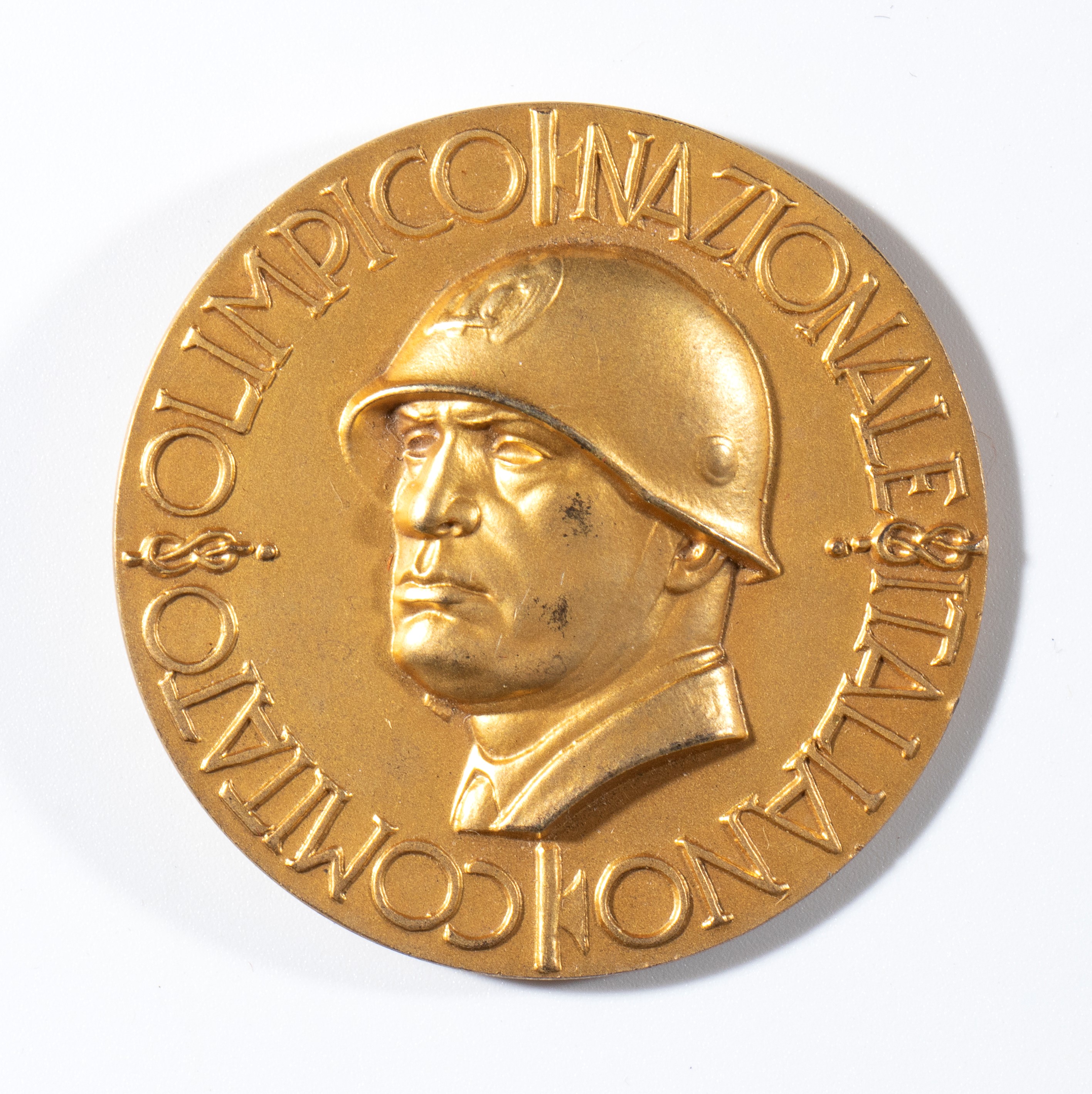 Medaglia del CONI Comitato Olimpico Nazionale Italiano in argento dorato, punzonato A 800. Al recto profilo elmato del Duce di 3/4. Al verso la vittoria alata con fascio littorio e ramo di alloro che accompagna l'atleta al saluto fascista verso la vittoria, anelli olimpici con fascio. Opus Publio Morbiducci (?) non firmato.