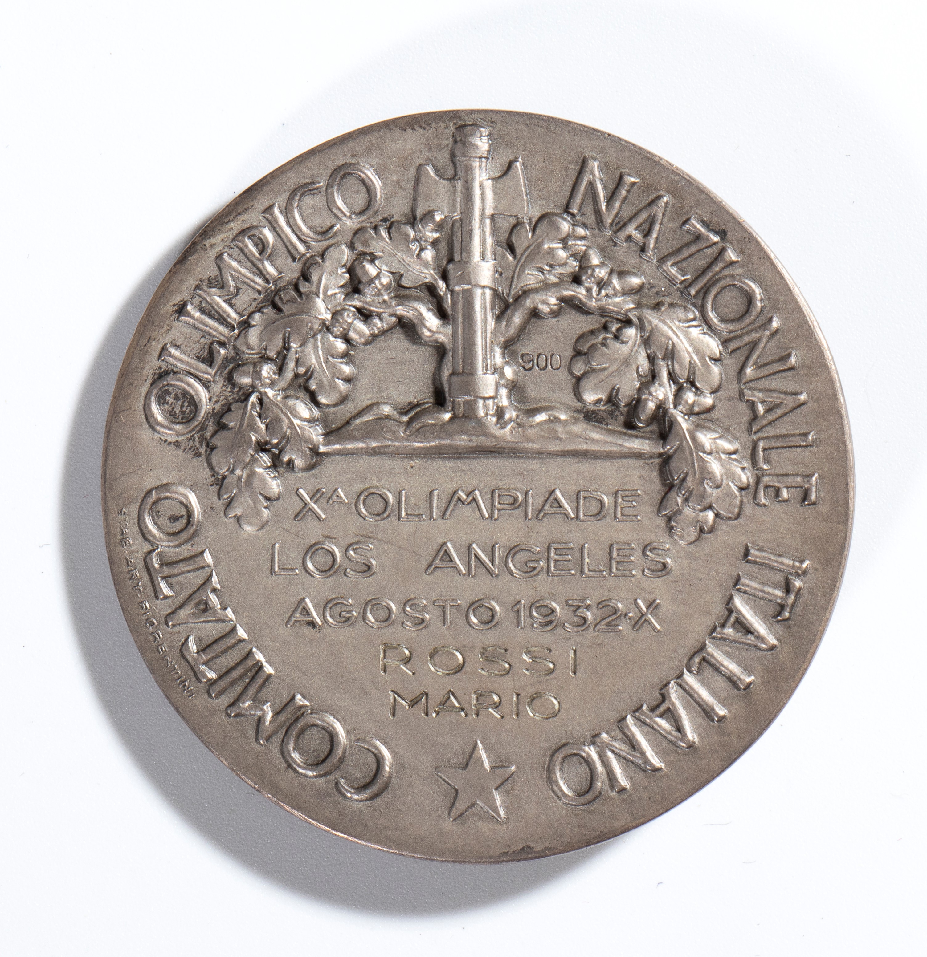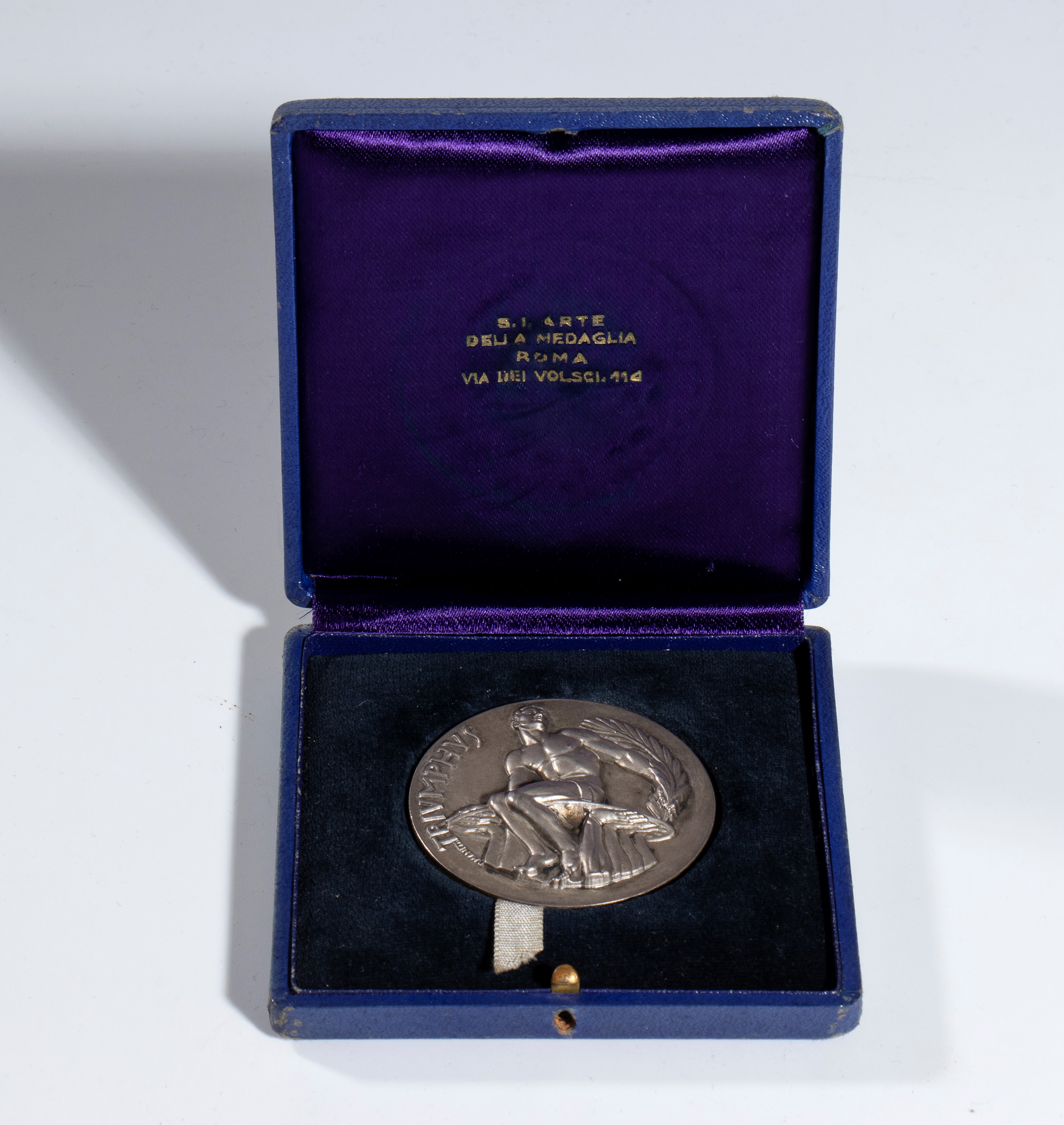 Medaglia del Comitato Olimpico Nazionale Italiano CONI per le OLIMPIADI di Los Angeles del 1932 , nominativa per alto funzionario accompagnatore della comitiva azzurra. Opus MANETTI, marcata Stabilimenti Artistici Fiorentini, in Argento 900 punzonato, circa mm.50 di diametro, in cofanetto originale marcato dalla casa distributrice S.I. ARTE DELLA MEDAGLIA recante fregio del CONI con fascio littorio impresso a caratteri argentati sul coperchio. Medaglia in perfette condizioni