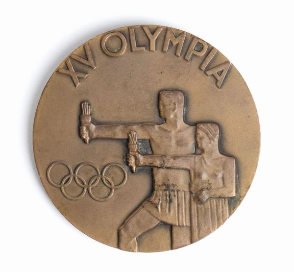 Medaglia in bronzo di partecipazione per atleti ai giochi olimpici della XV OLYMPIA HELSINKI 1952 HELSINGFORS - Disegnata e firmata da Kauko Räsänen, realizzata da Veljekset Sundqvist Oy - Patina del tempo, nessun danno, condizioni molto buone
