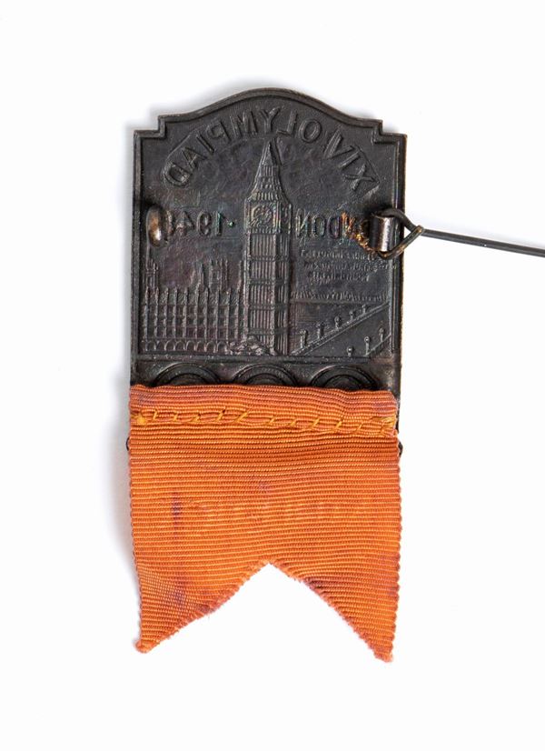 Badge della XIV Olimpiadi di Londra 1948 - In bronzo con nastrino a bandierina arancio recante la dicitura ATHLETICS. Ottime condizioni