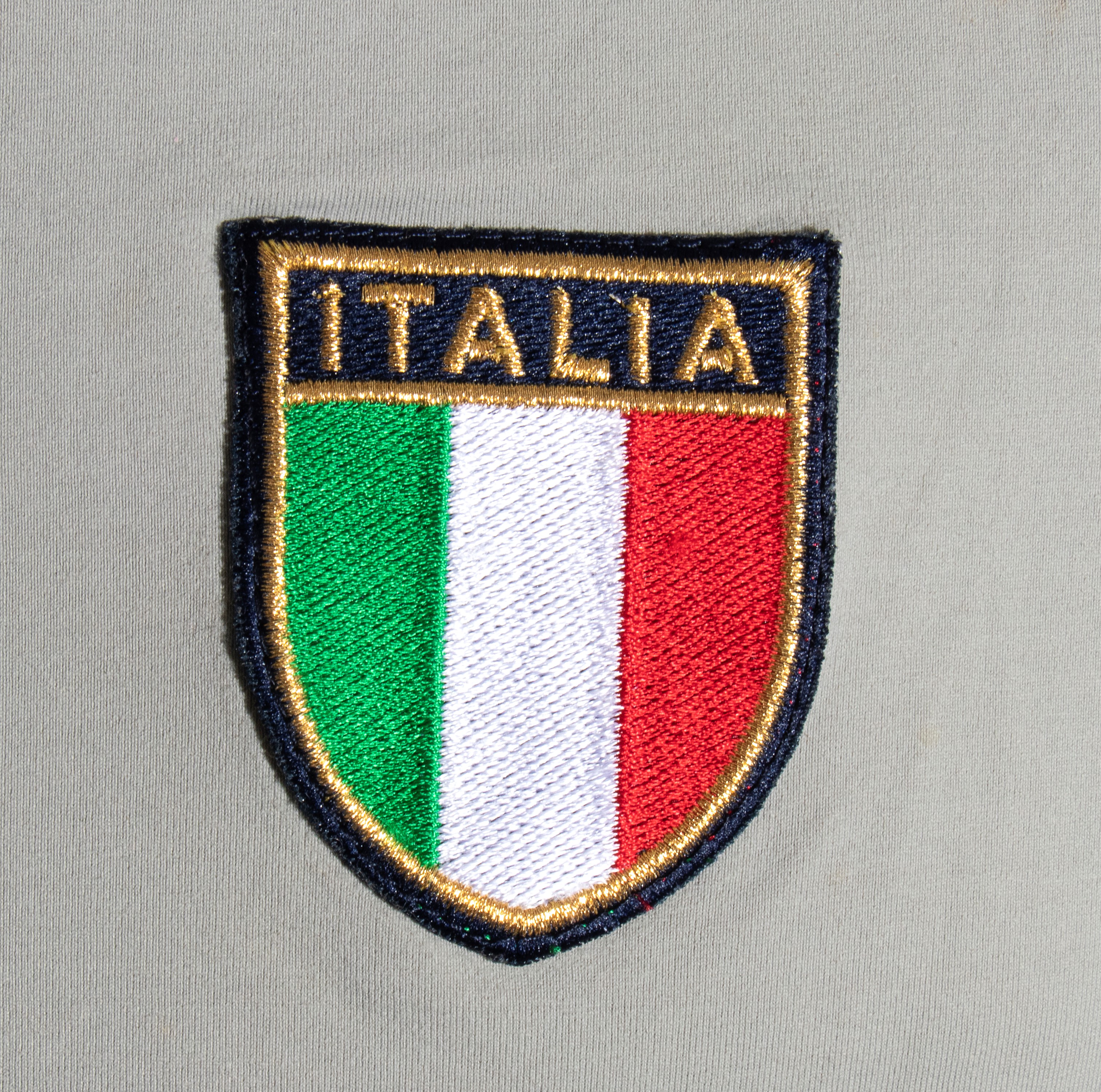 Sul fronte: logo FIGC scudetto tricolore ITALIA cucito sulla sinistra, realizzato in cotone colorato e dettagli dorati ; numero 12 piccolo in sublimatico