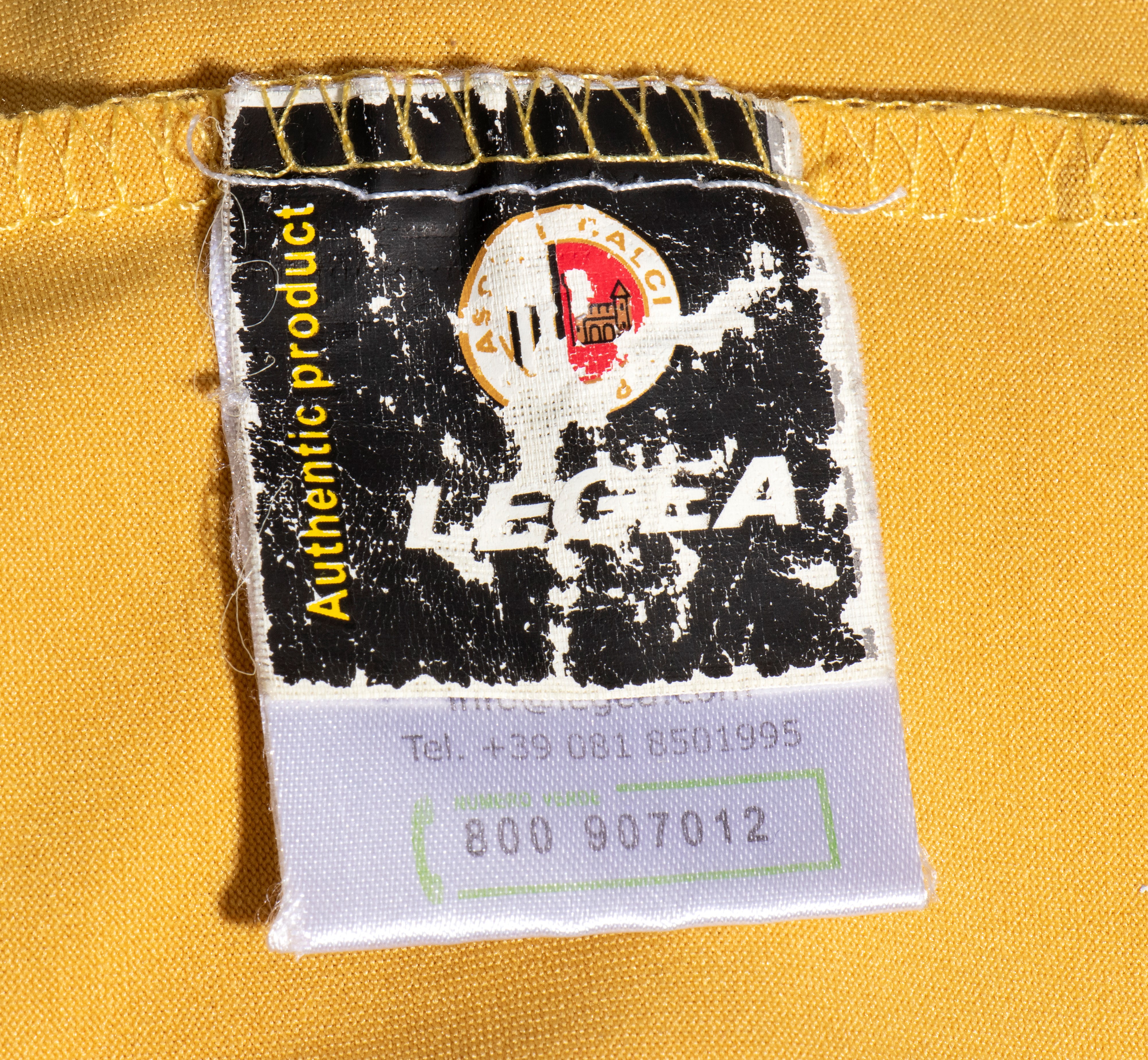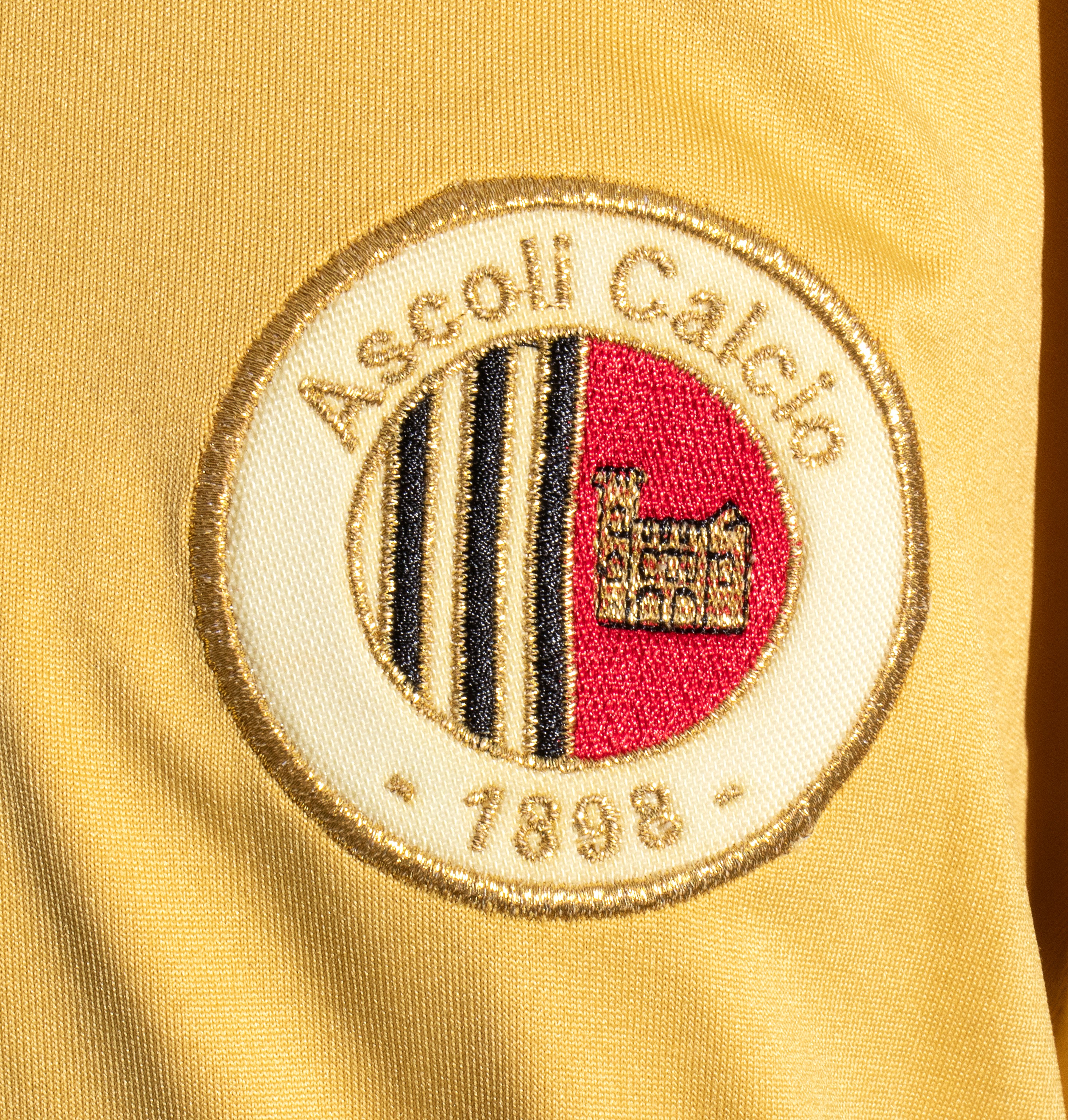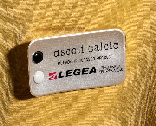 Sul fronte: logo LEGEA ricamato, FABIANPLASTIC stampato, logo ASCOLI CALCIO 1898 cucito, sponsor CULT applicato (distaccamento in alcuni punti) , in basso targhetta "ASCOLI CALCIO - Authentic Licensed Product Legea"