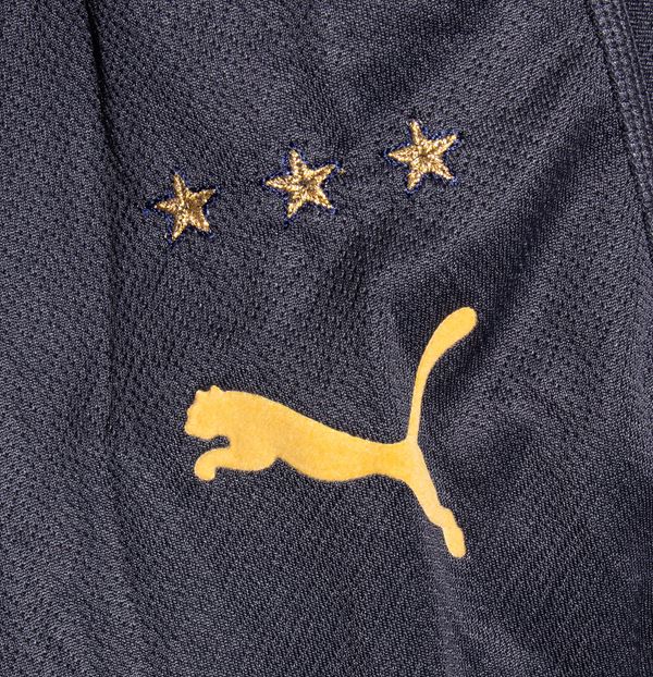 Sulle maniche : logo PUMA ricamato ; sulla destra tre stelle ricamate per i tre titoli mondiali