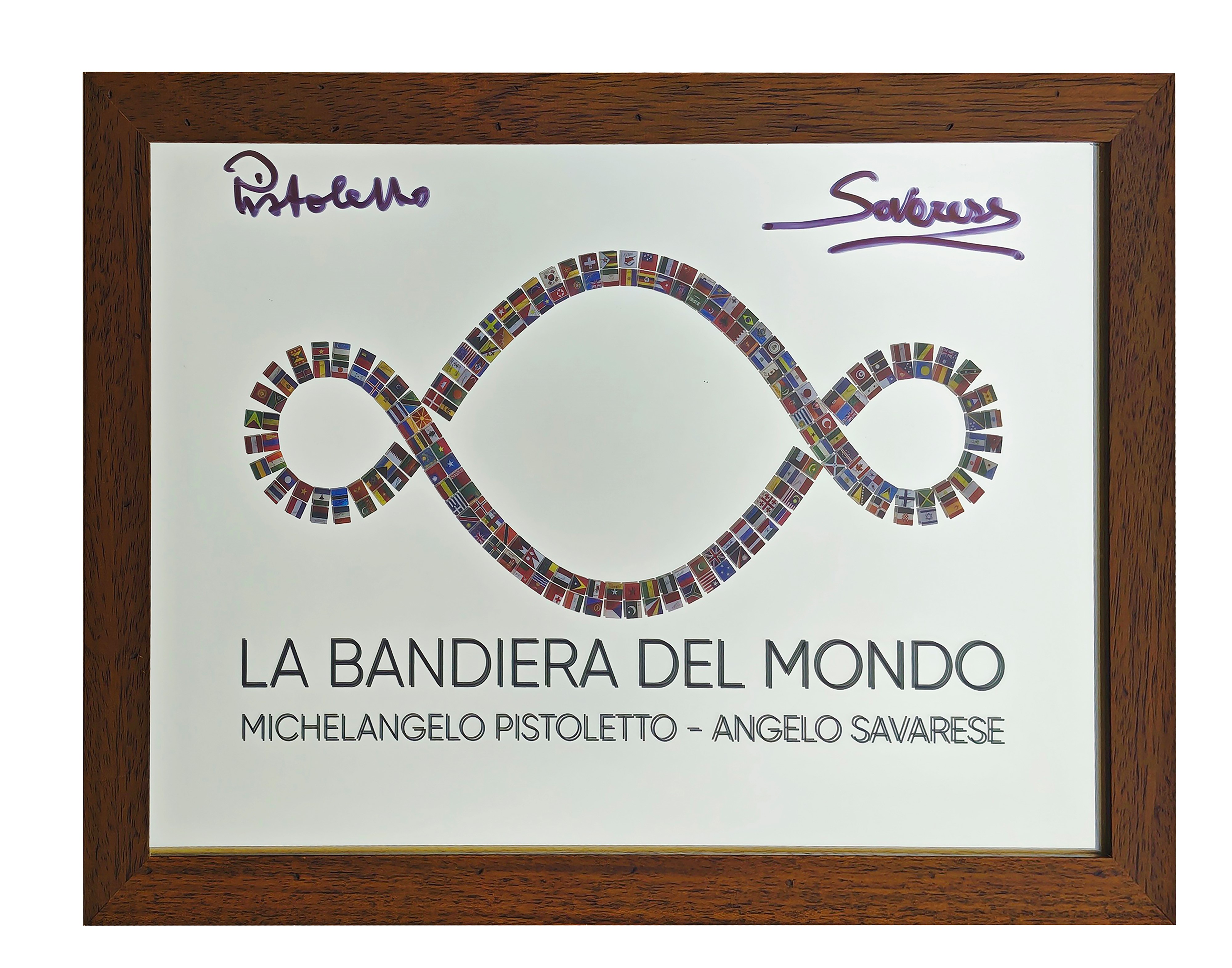 Opera dal titolo LA BANDIERA DEL MONDO realizzata su specchio, delle dimensioni di cm. 50x35, con applicazione di una stampa adesiva trasparente. Su progetto originale di Michelangelo Pistoletto ed Angelo Savarese