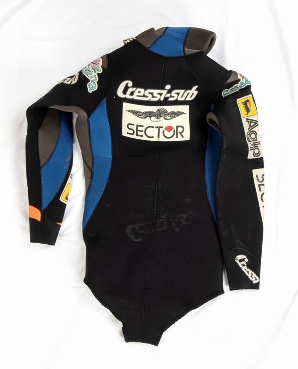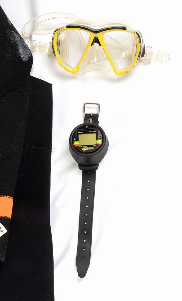 Equipaggiamento originale appartenuto a Umberto Pellizzari usato nel 2000 durante la realizzazione del film IMAX (2D) dal titolo OceanMen insieme al "rivale" Pipin Ferreras. Muta Cressi Sub composta da "giacca" e pantaloni con sponsor CRESSI, Agip, Sector, firmata con dedica ed autografo originali scritti di pugno con pennarello nero UMBERTO PELLIZZARI 80 115 150 ad indicare le profondità raggiunte nei records. In aggiunta un paio di occhiali ed un profondimetro MARES usati sempre da Pellizzari, con una foto cartolina autografata in originale UMBERTO PELLIZZARI 80 115 150. Materiale usato, in ottime condizioni.