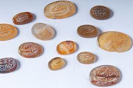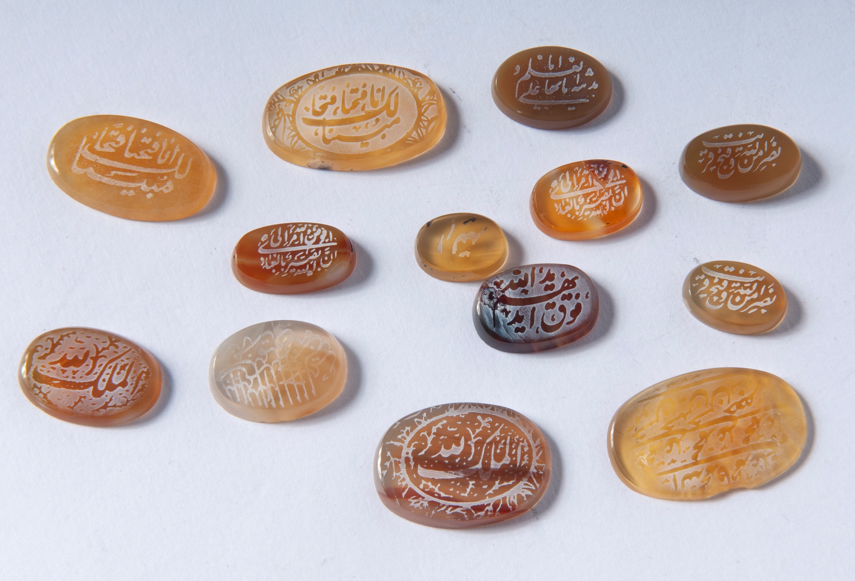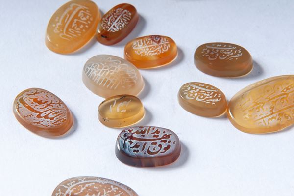 Lotto di 50 corniole lavorate con iscrizioni, XX secolo