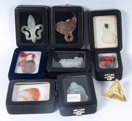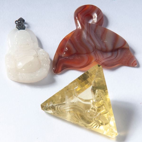 Lotto di sette sculture in materiale lapideo e un quarzo fumè, XX secolo