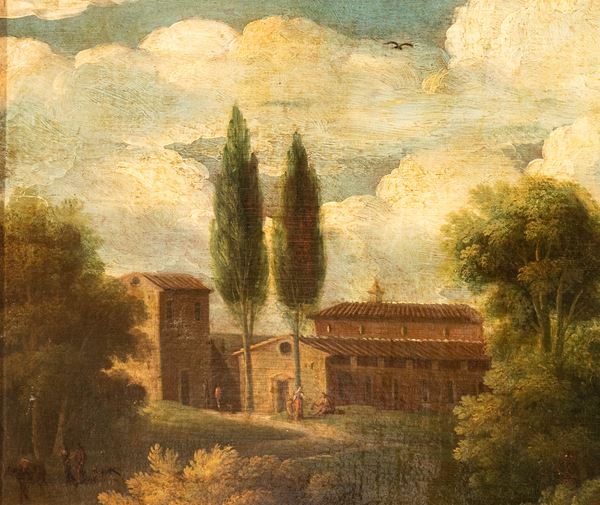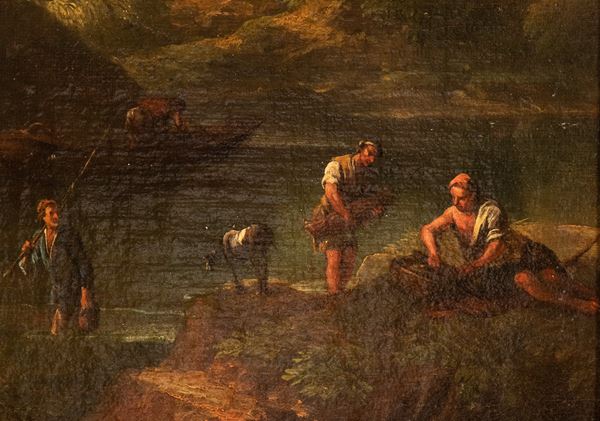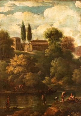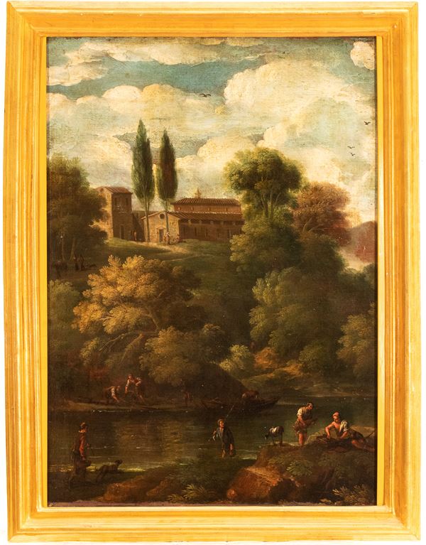 Paesaggio fluviale con figure e borgo sullo sfondo