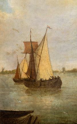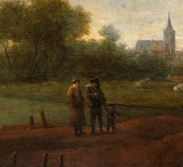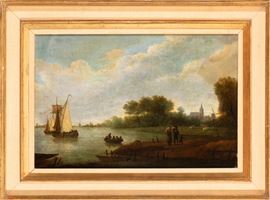 Paesaggio fluviale con veliero, viandanti e borgo sullo sfondo