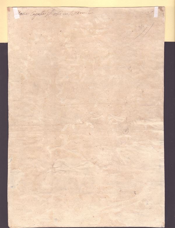 Impressione su carta vergellata con filigrana (pellegrino nel cerchio). Sottile margine oltre alla battuta della lastra. Assottigliamenti della carta, esemplare controfondato con carta cina. Una nota manoscritta al verso. Nel complesso in buono stato di conservazione.