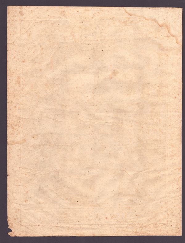 Bella impressione su carta vergata con filigrana (lettera P nel cerchio sormontata dalla croce). Esemplare con margini di circa 1,5 cm su ogni lato. Foglio con fioriture sparse, una leggera gora in alto, un piccolo strappo a destra, ricomposto, una mancanza in basso a destra e leggere sgualciture, ma nel complesso in buono stato di conservazione.