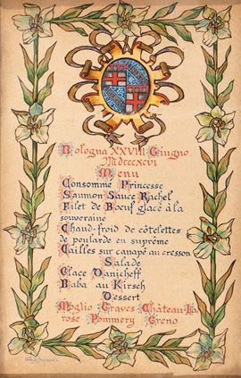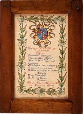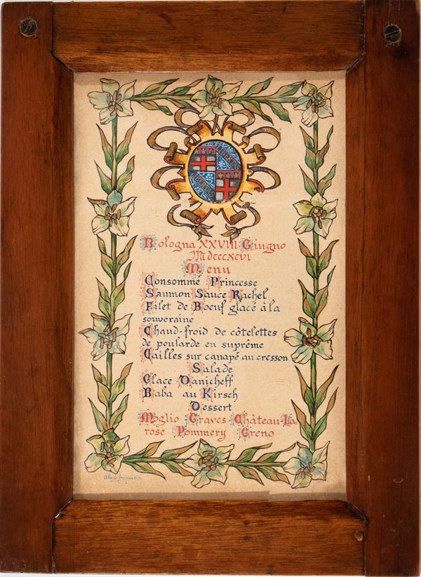 Inchiostro nero, inchiostro rosso, acquerello e dorature su carta non vergata, 152 × 98 mm. Firmato in basso a sinistra: Alberto Pasquinelli. Con cornice originale (20,5 × 15 cm).