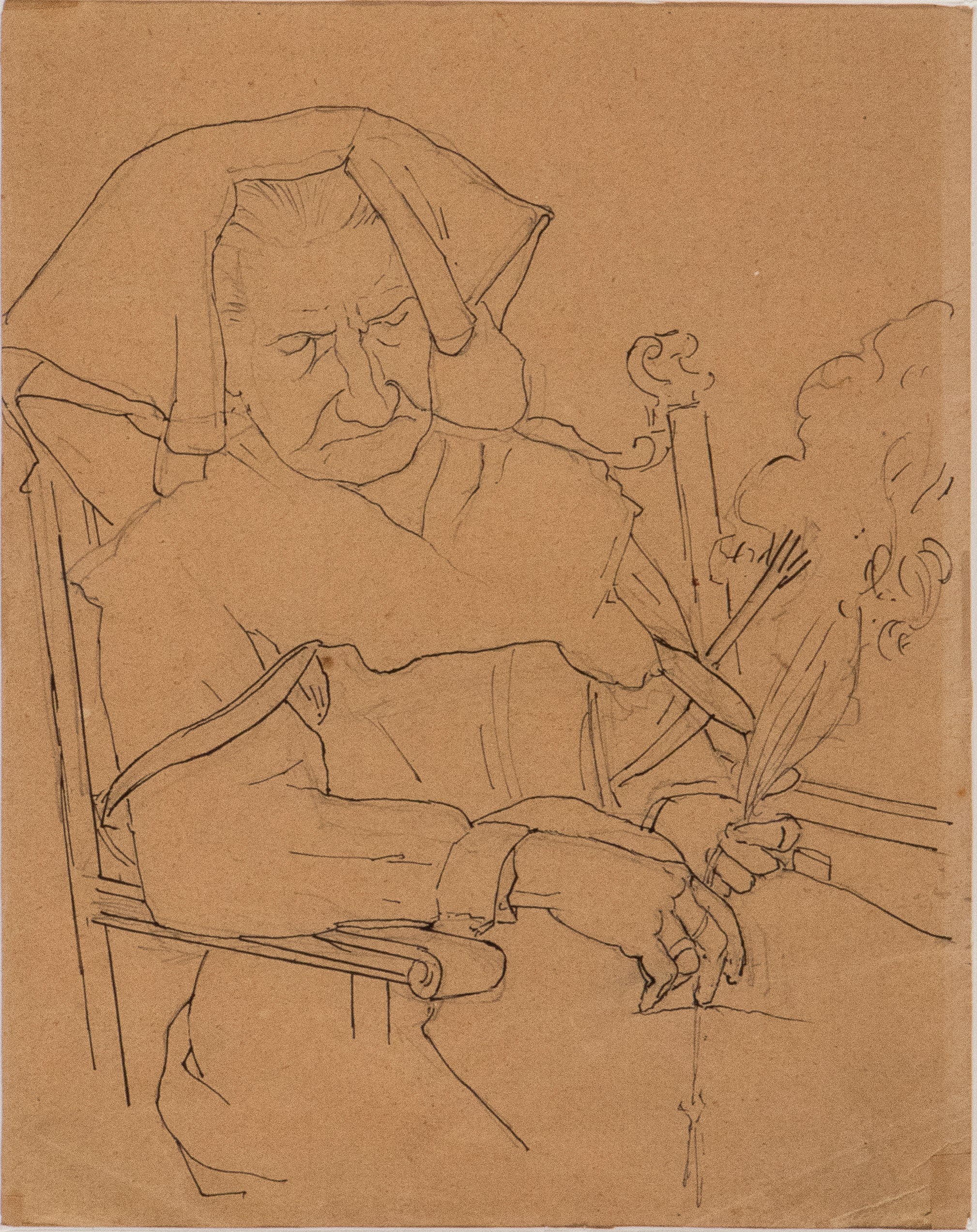 Inchiostro nero e penna su tracce di matita su carta non vergata, 155 x 120 mm. Con passe-partout e cornice (28 x 24,5 x 2 cm).