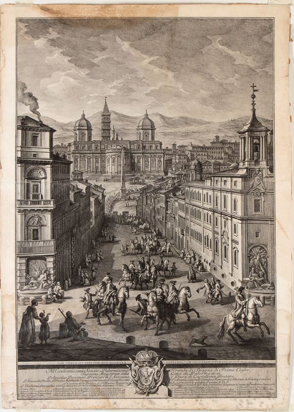 Cadauna impressa su tre fogli di carta non vergata, uniti. Stato di conservazione discreto: parte incisa preservata, con margini oltre la battuta della lastra. Carta brunita con macchie diffuse, residui di vecchi incollaggi al verso, abrasioni, alcuni strappi e lacune ai margini. Da restaurare.