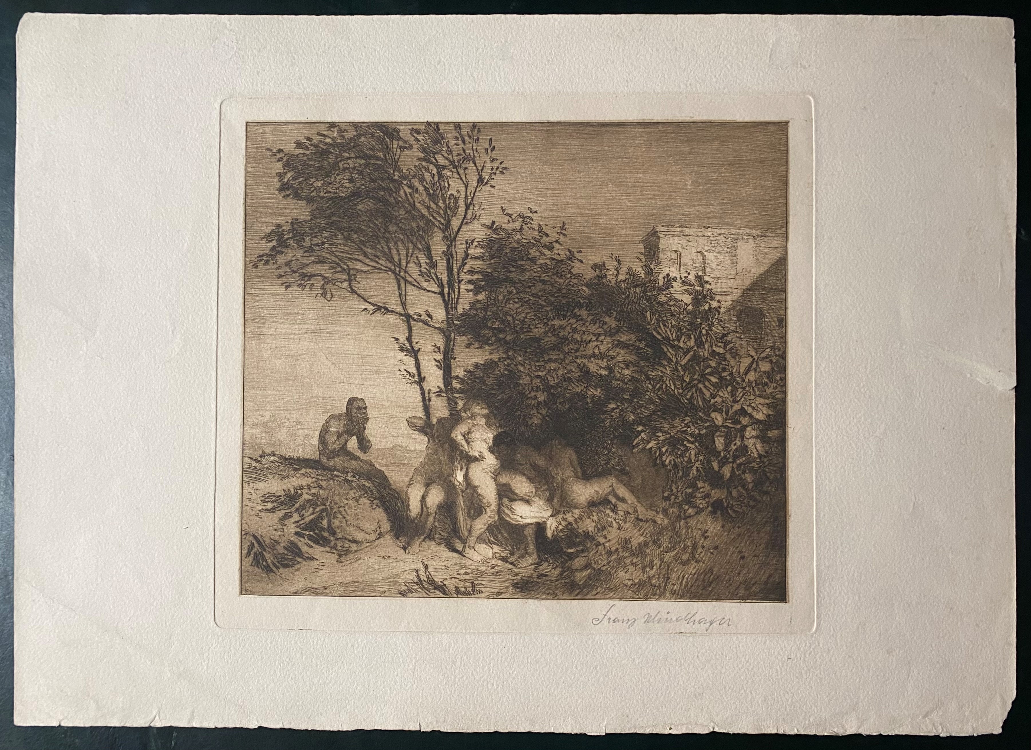Molto bella impressione ad inchiostro color seppia. Foglio con ampi margini, in ottimo stato di conservazione salvo une piega e piccola mancanza al angolo inferiore destro.