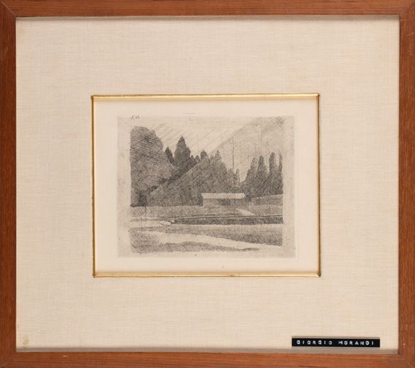 2° stato: la lastra è stata biffata e reca nell'angolo superiore sinistro la numerazione: XVI. Nessuna tiratura. Firmato a matita in basso destra: Morandi, prova di stampa