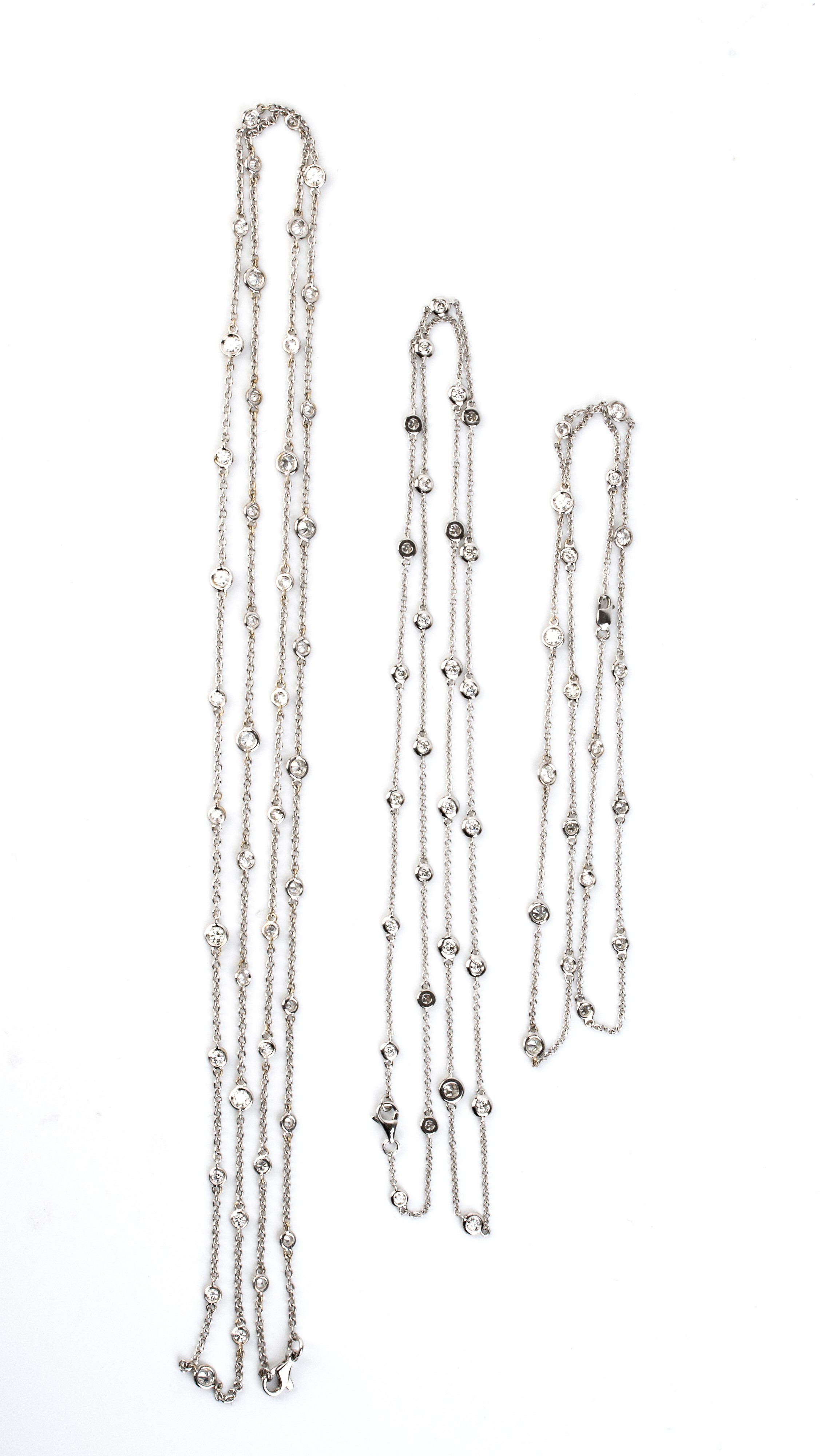 Punzonati "750". Lunghezza catenine: 1110 cm; 80 cm; 59 cm. Peso totale: 37.4 g.