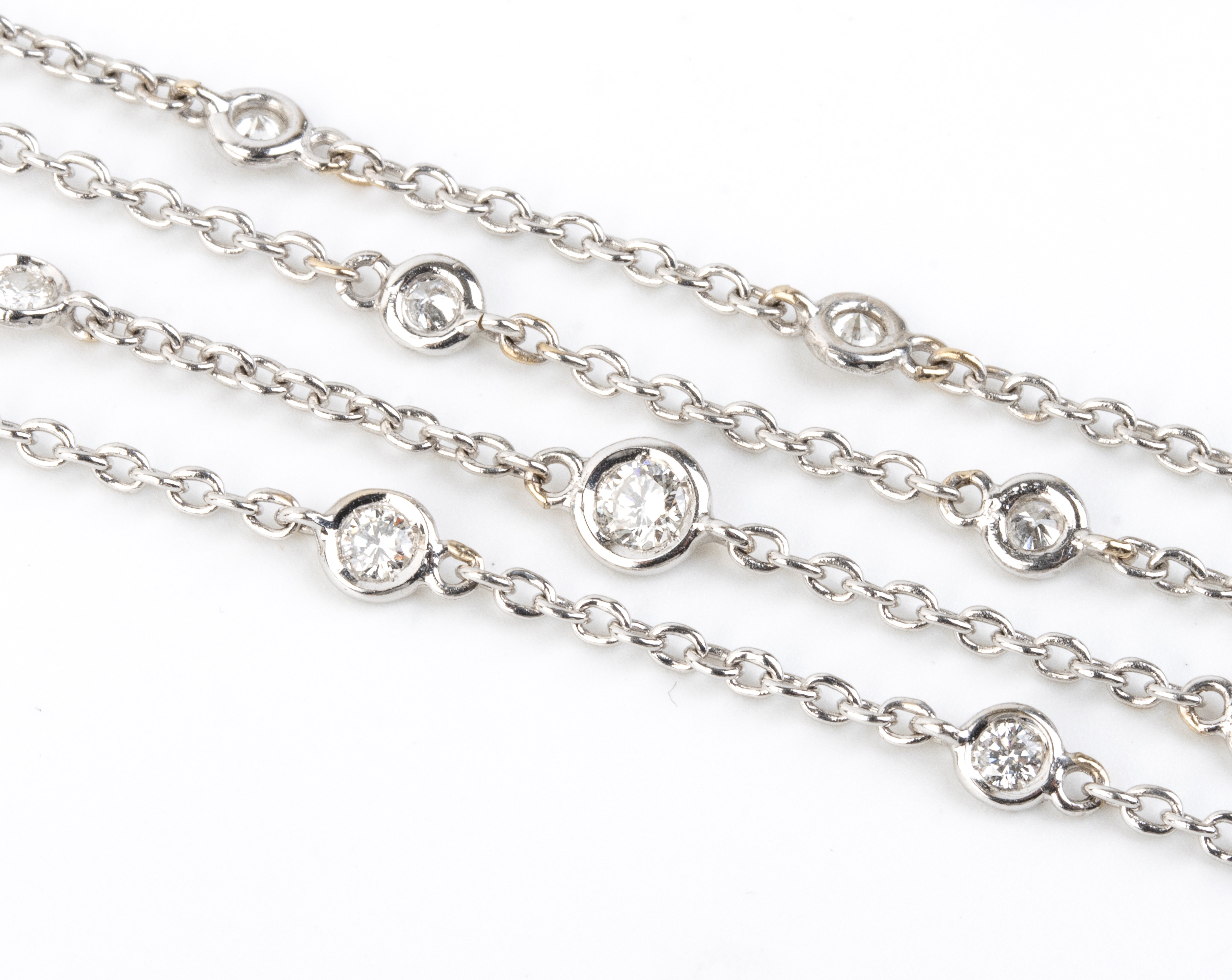 in oro bianco 18k, ciascuna con catena a maglia forzatina interrotta da castoni con diamanti.
