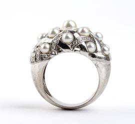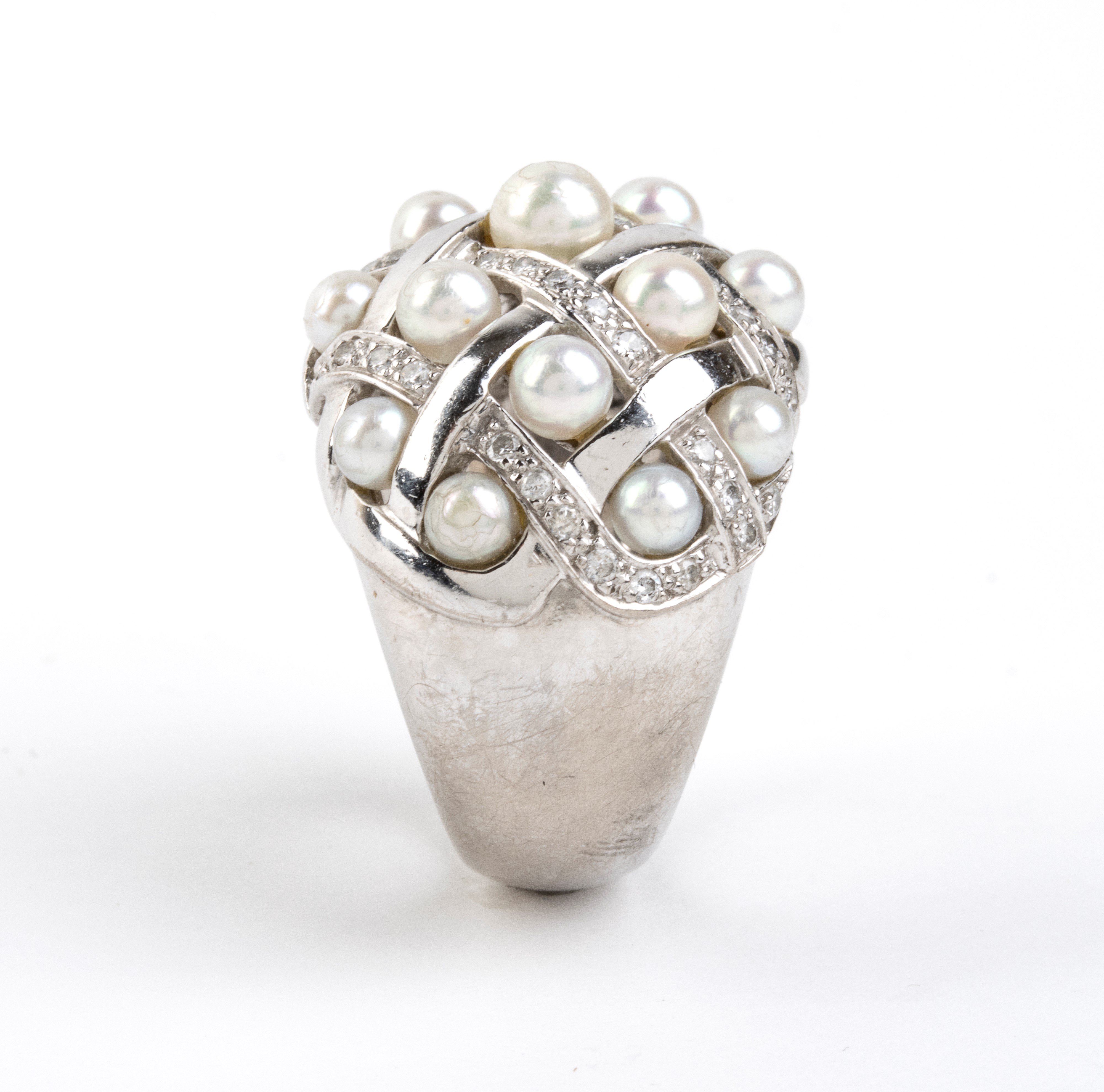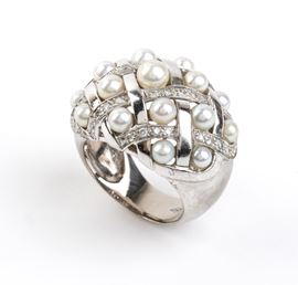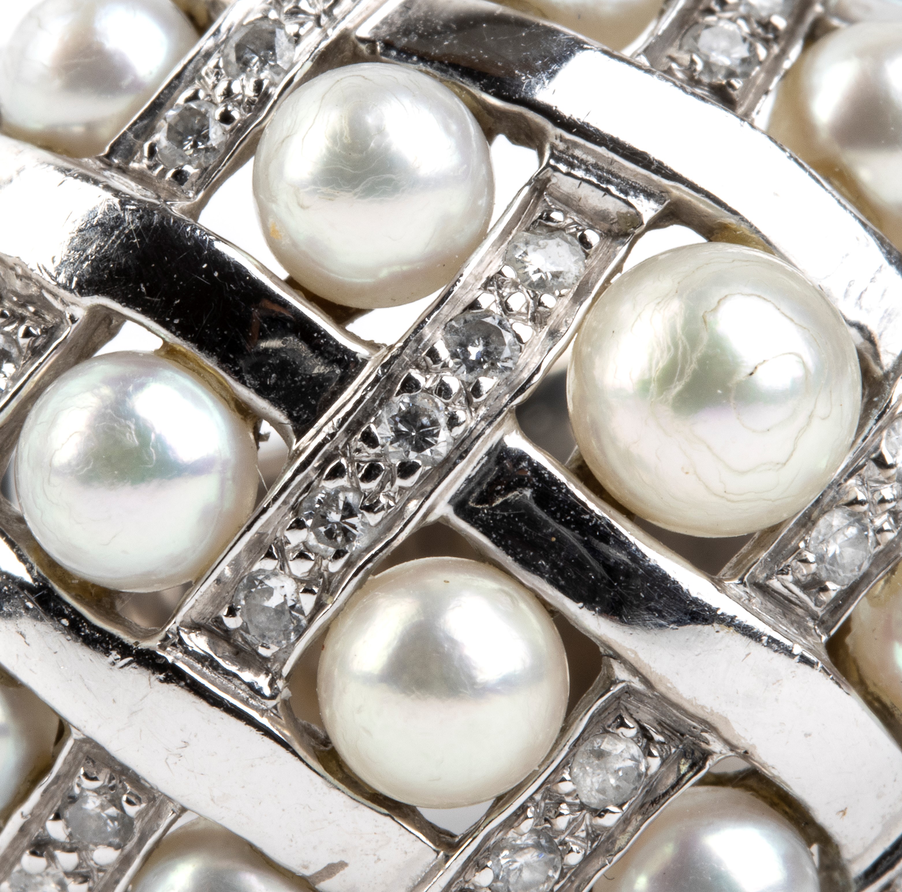 in oro bianco 18k, con piccole perle coltivate d'acqua salata e motivo di intreccio di nastri impreziosito da file di diamanti taglio brillante, stimati per un peso totale di circa 0.50 ct, colore H-I, purezza VS-SI.