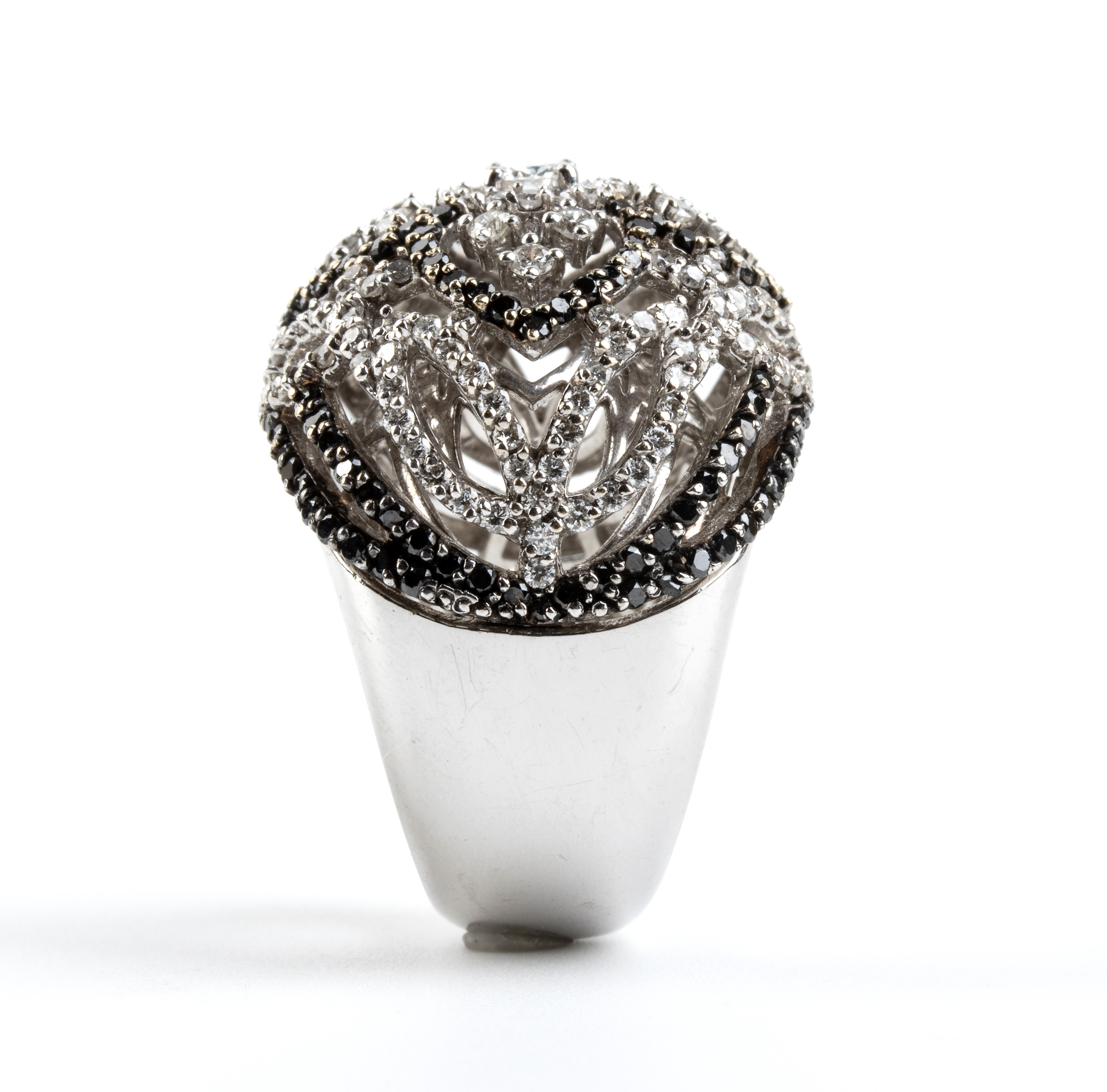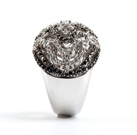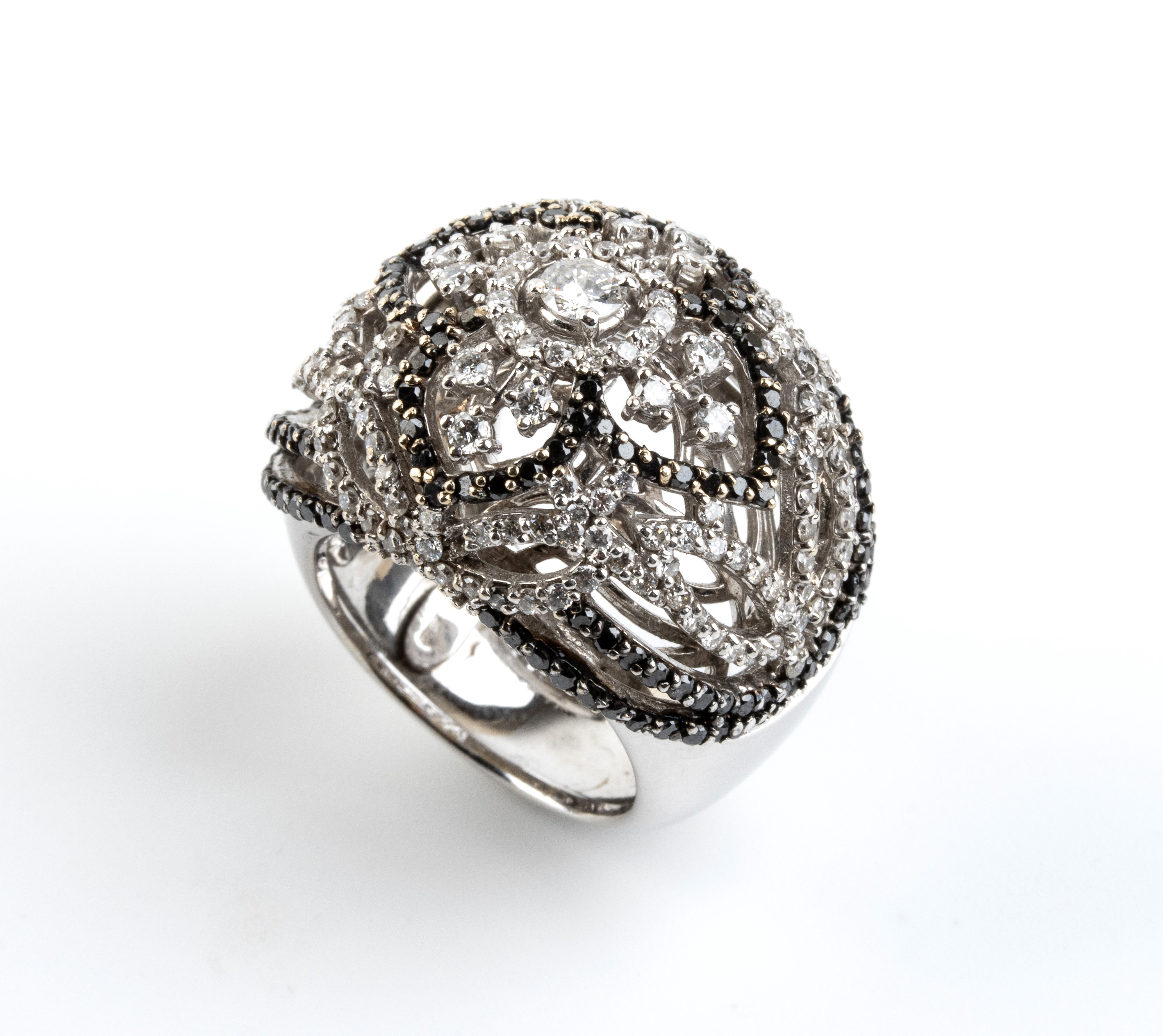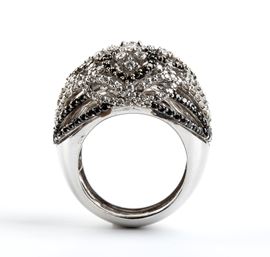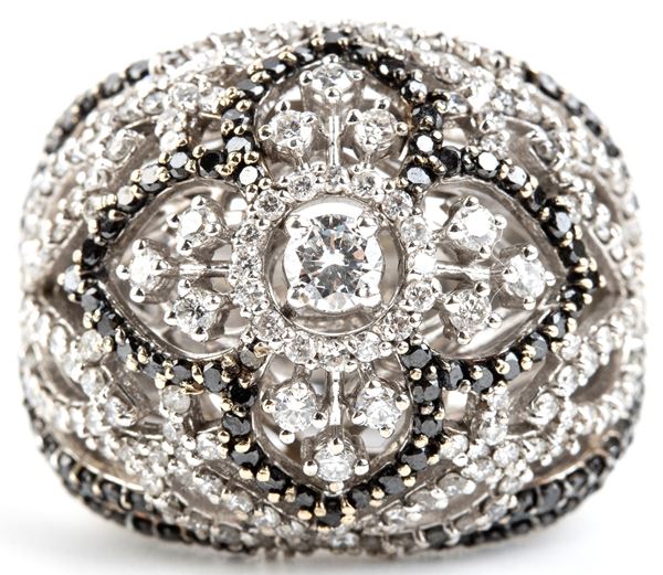 in oro bianco 18k, modellato come una fascia traforata a motivo di nastri in diamanti incolori taglio brillante, stimati per un peso totale di circa 1.80, ct e diamanti neri stimati per un peso totale di circa 1.20 ct.
