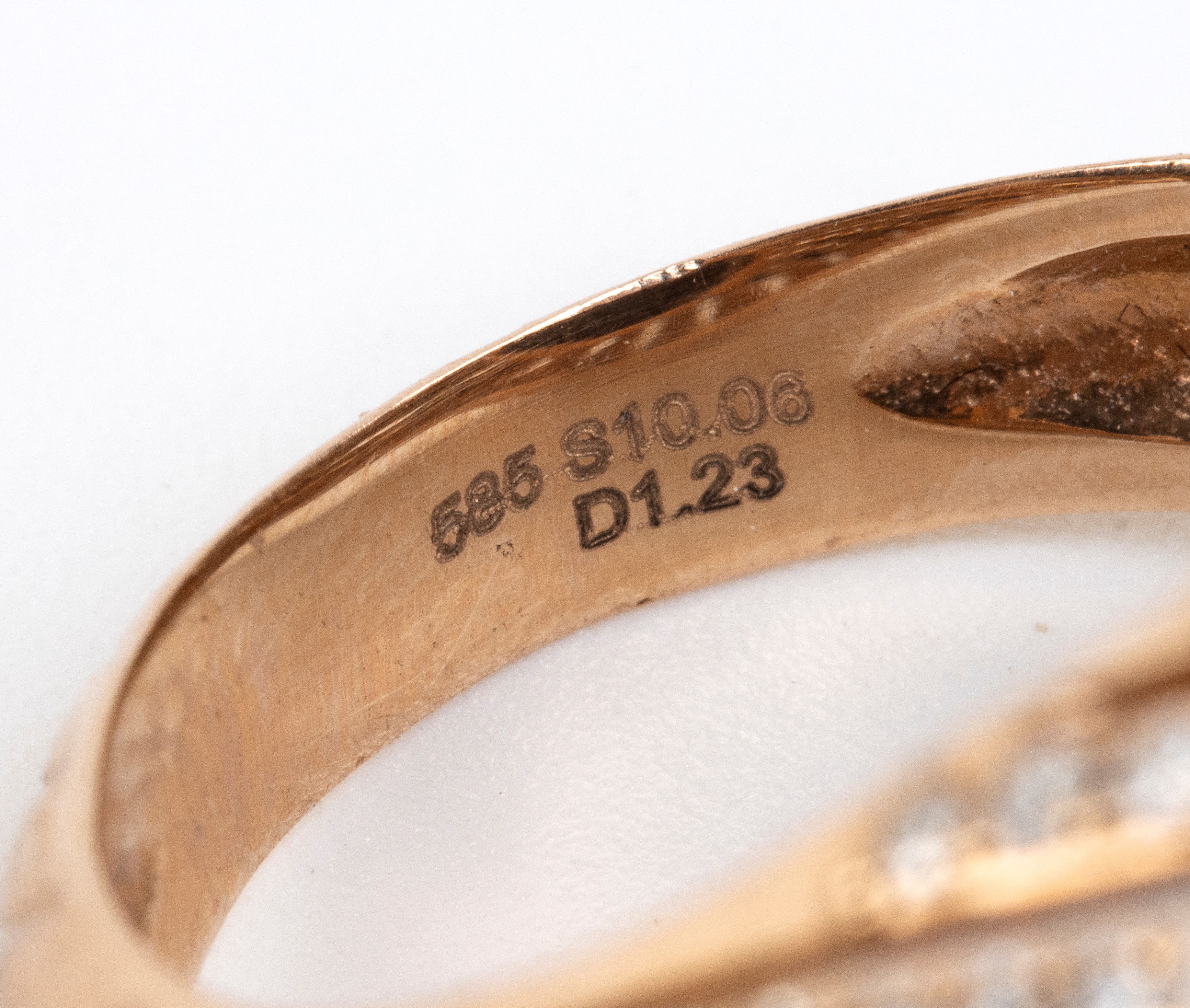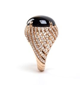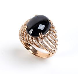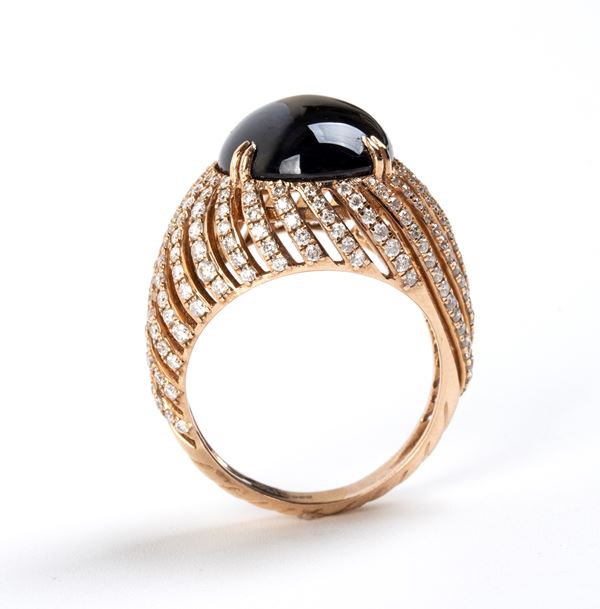 modellato come una fascia traforata in oro rosa 14k, incastonato con cabochon di zaffiro, lati della montatura decorati con file di diamanti.