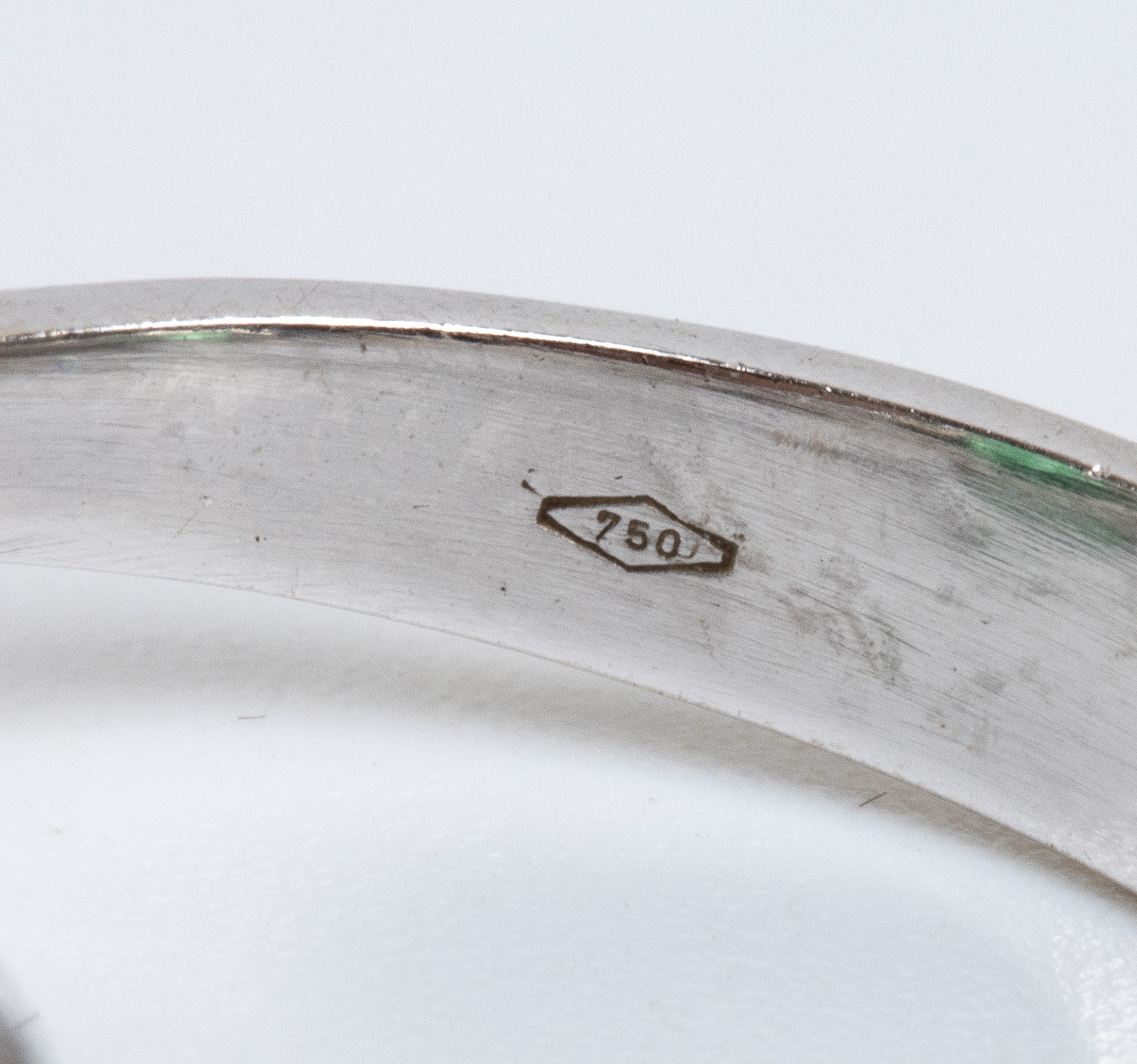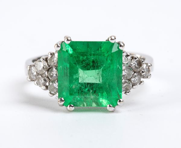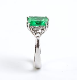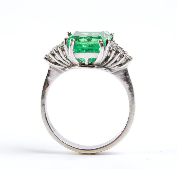 in oro bianco 18k, incastonato con smeraldo affiancato da diamanti.