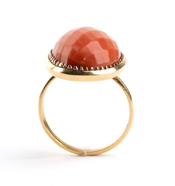 in oro giallo, incastonato con cabochon faccettato di corallo Mediterraneo (Corallium Rubrum).