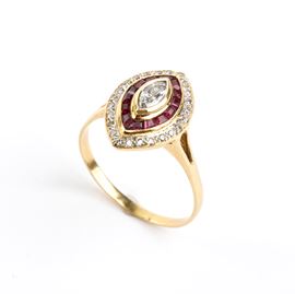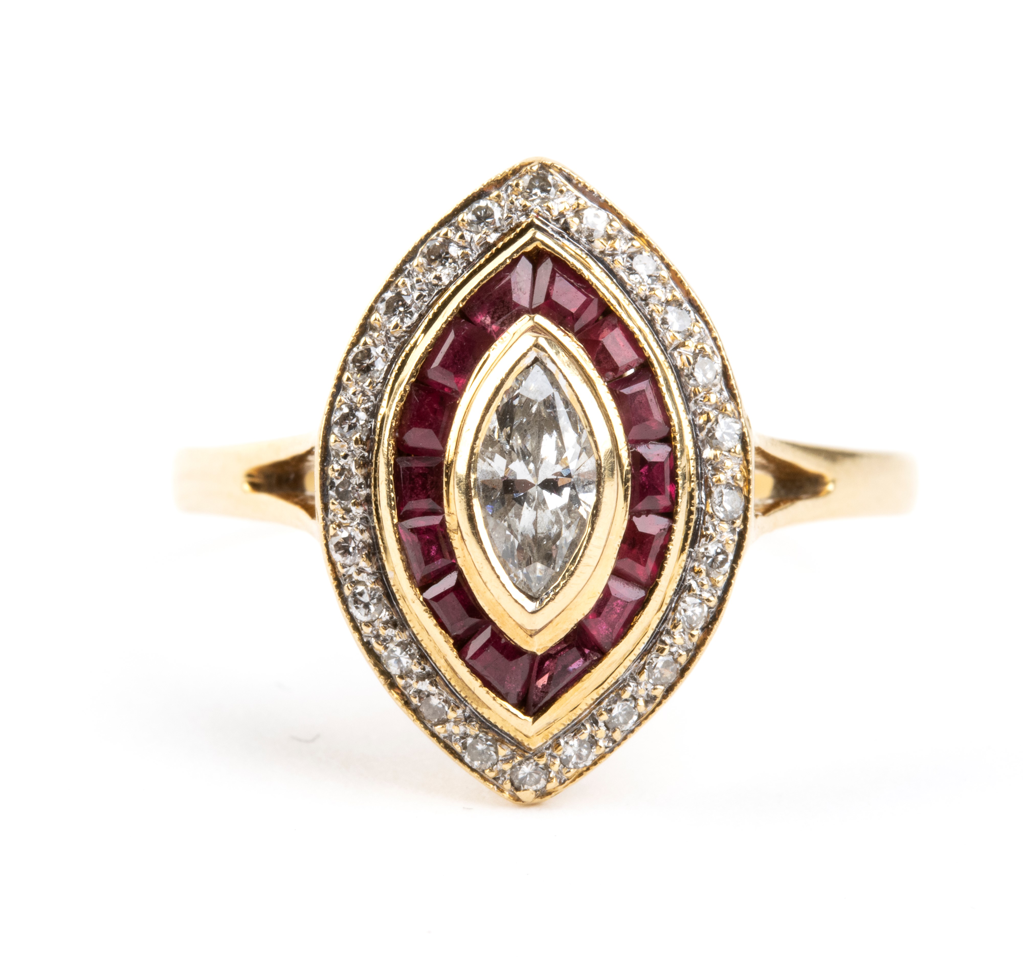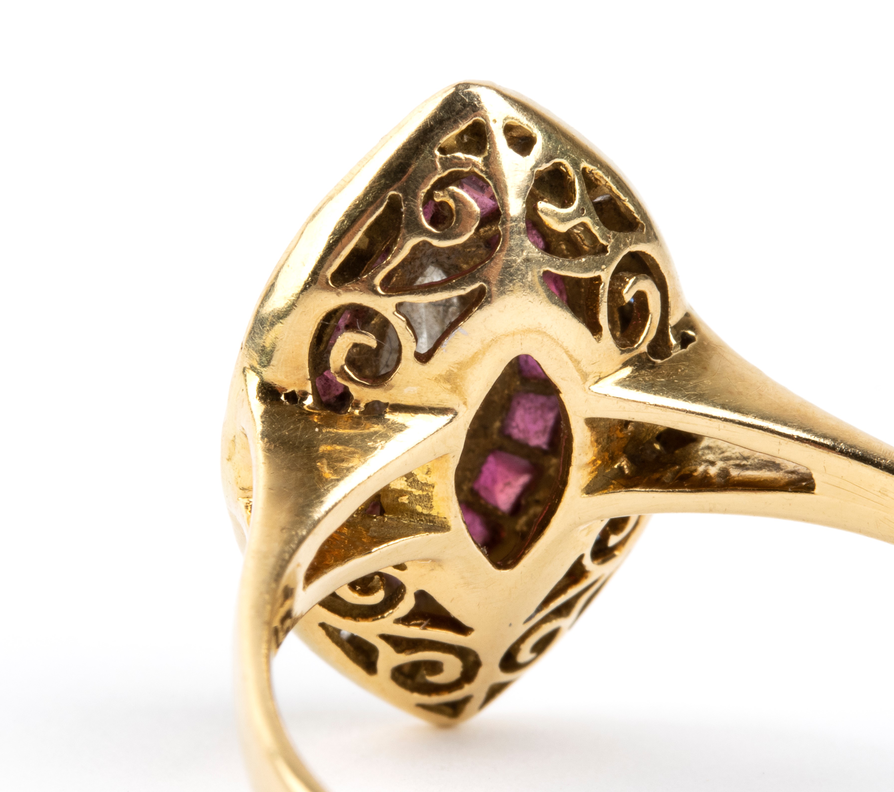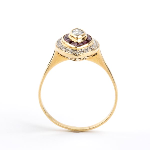 in oro giallo 18k, incastonato con navetta di diamante tra cornice di rubini e diamanti taglio brillante.