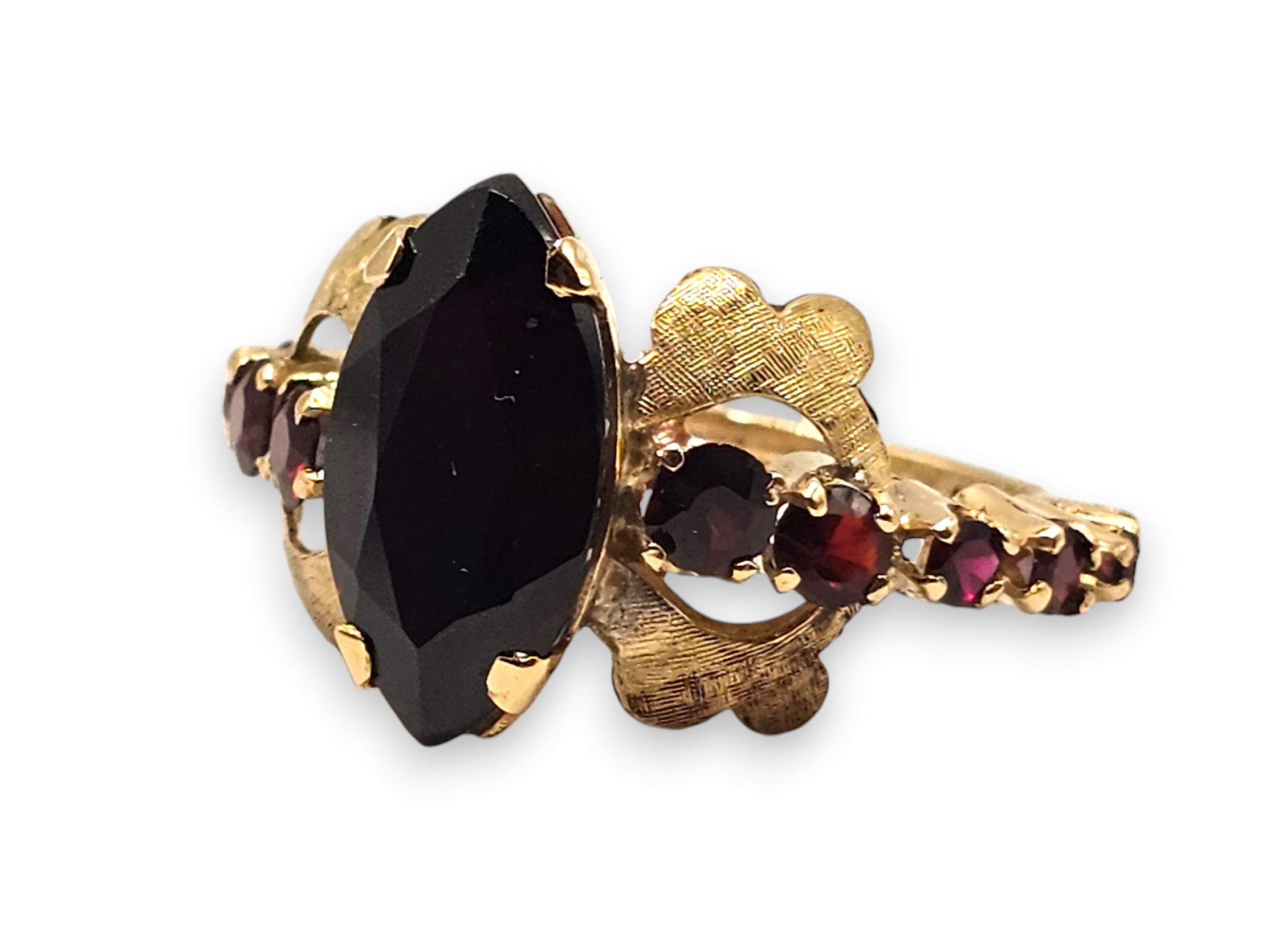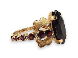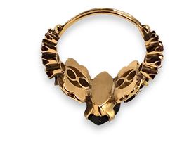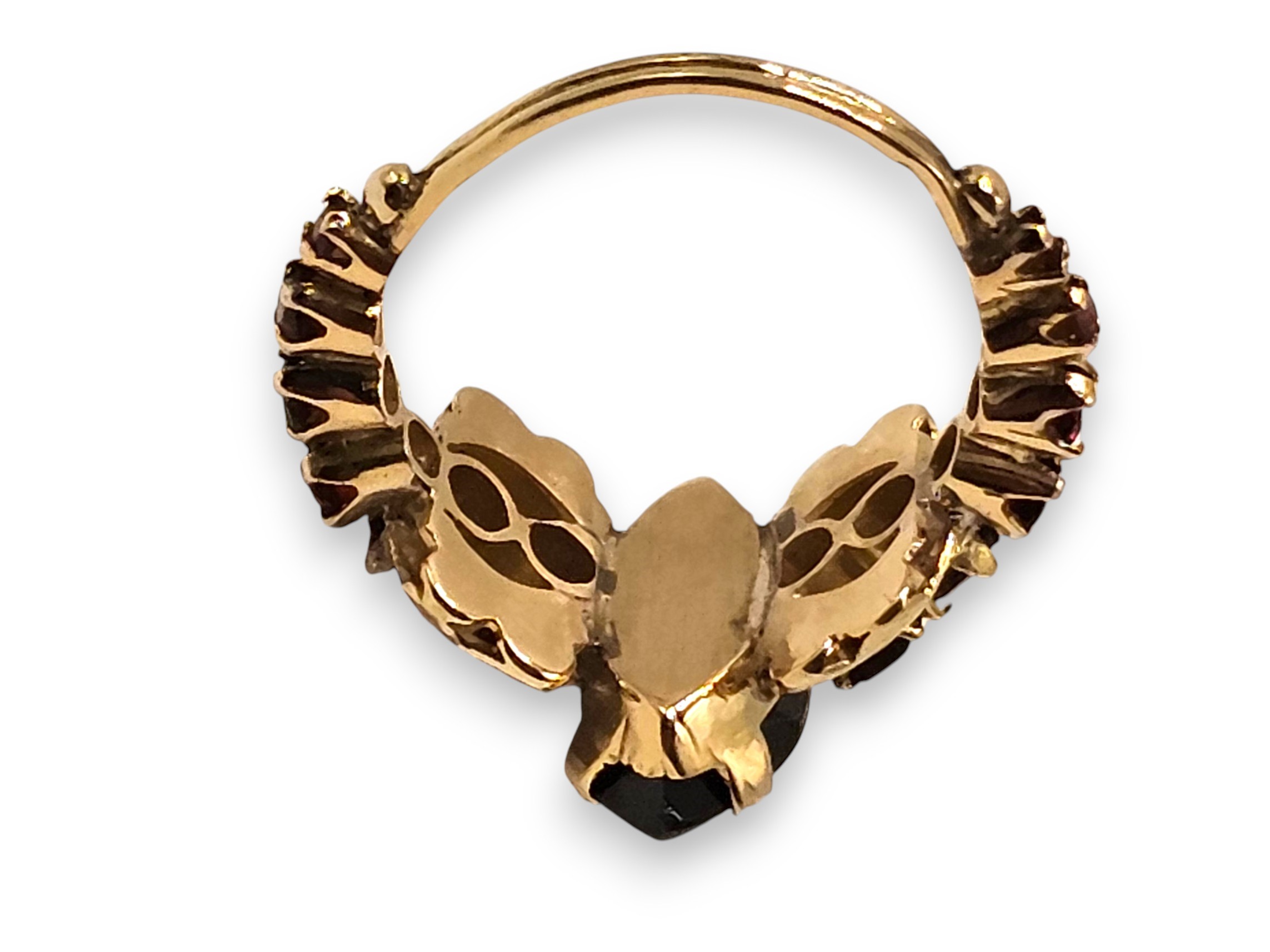 in oro giallo, incastonato con granato a forma di navetta affiancato da granati rotondi sui lati della montatura.