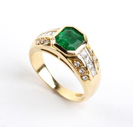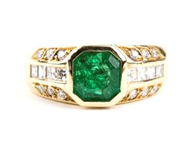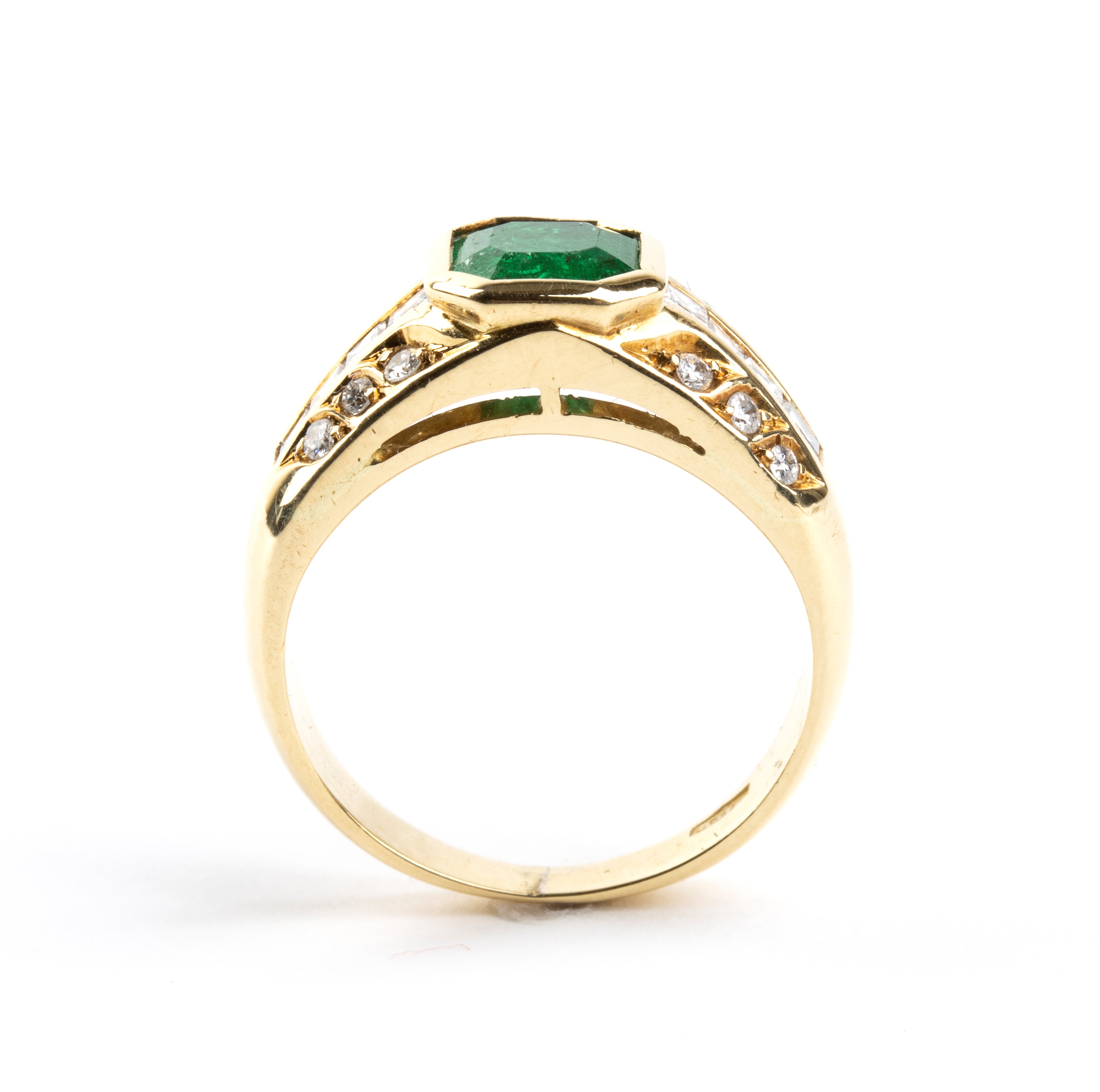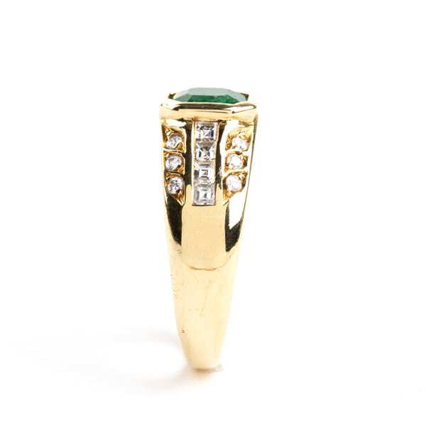in oro giallo 18k, incastonato con smeraldo ottagonale, circa 1.10 ct, affiancato da file di diamanti, stimati per un peso totale di circa 0.50 ct, colore H, purezza VVS-VS.