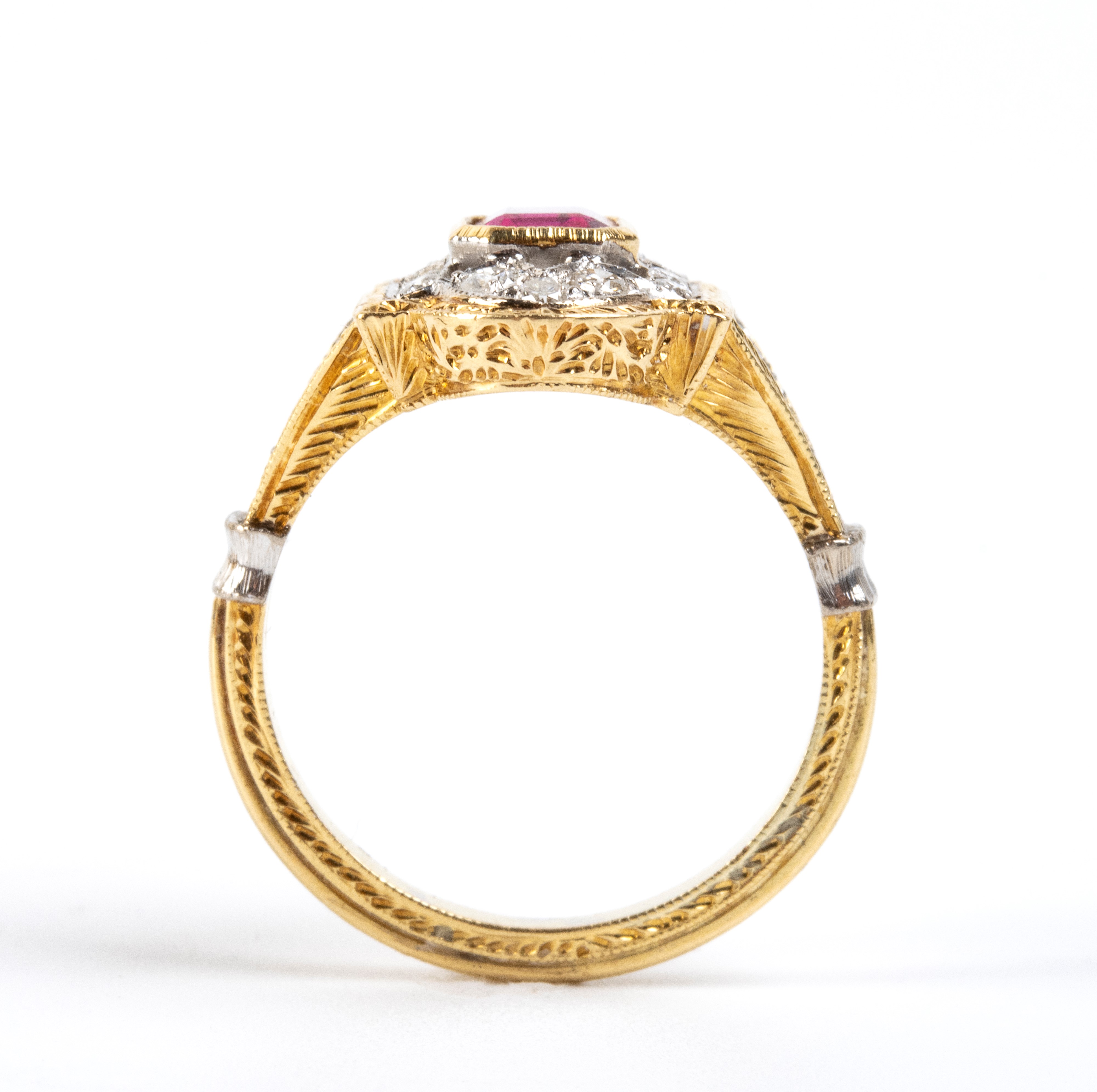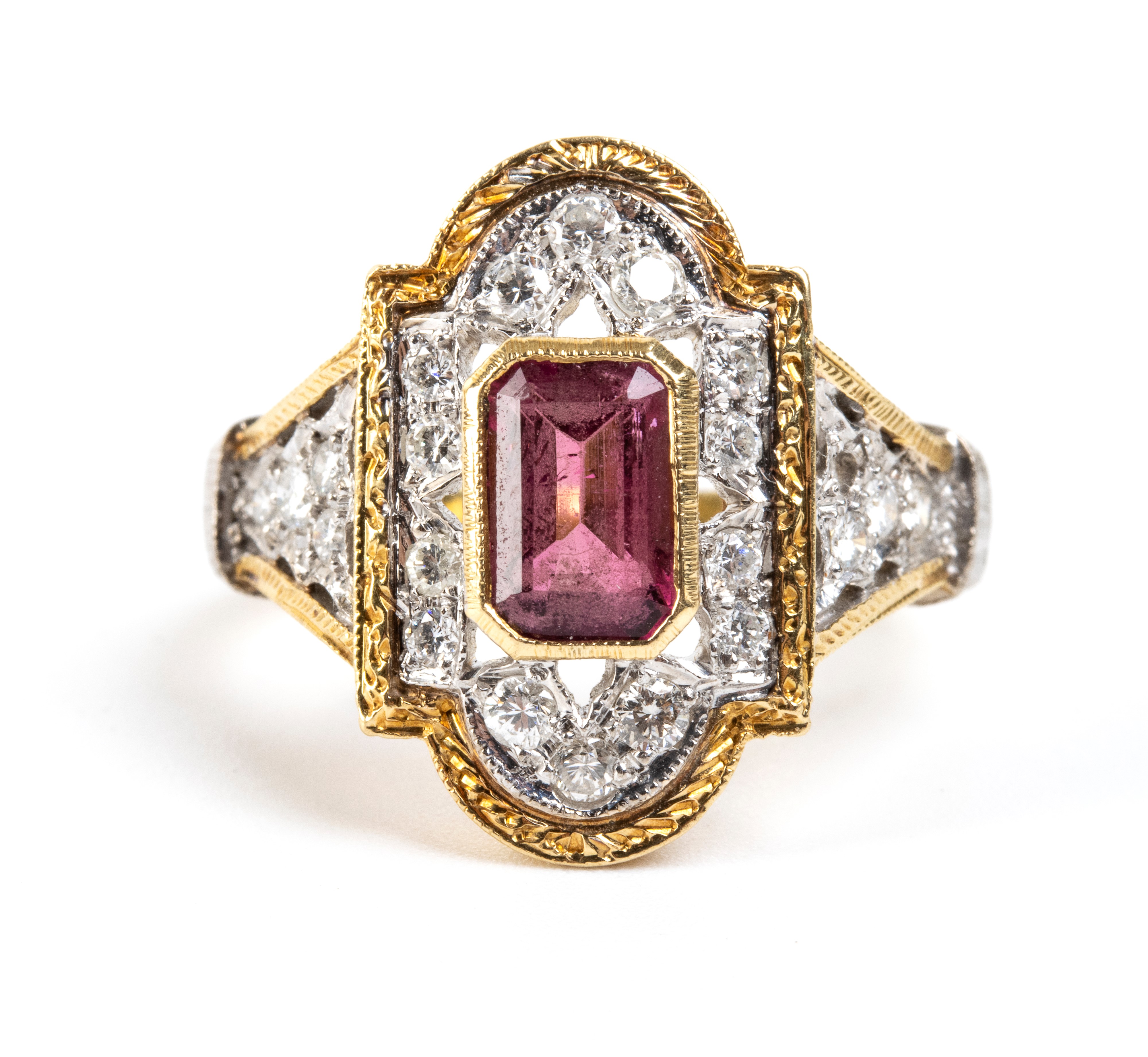 incastonato con tormalina rosa contornata da diamanti taglio brillante stimati per un peso totale di circa 0.30 ct, colore H-I, purezza VS.
