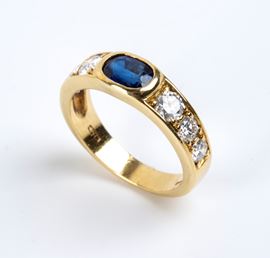 in oro giallo 18k, incastonato con zaffiro vale affiancato da paste vitree incolori.