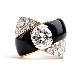 in giallo 18k, modellato come una fascia a motivo di nastri incrociati, incastonato con diamante centrale, lati della montatura decorati con smalto nero e pavè di diamanti.
