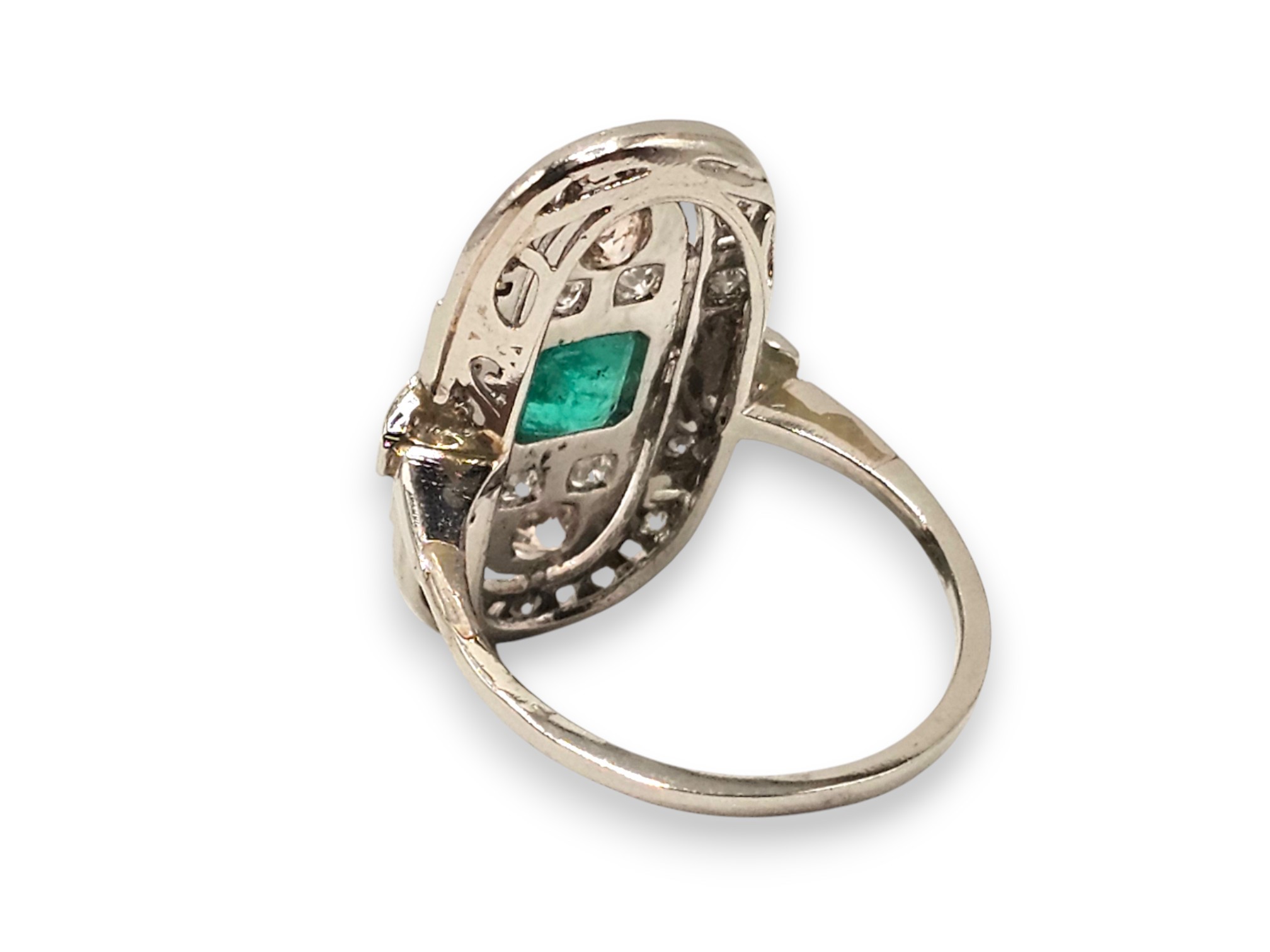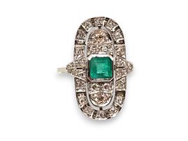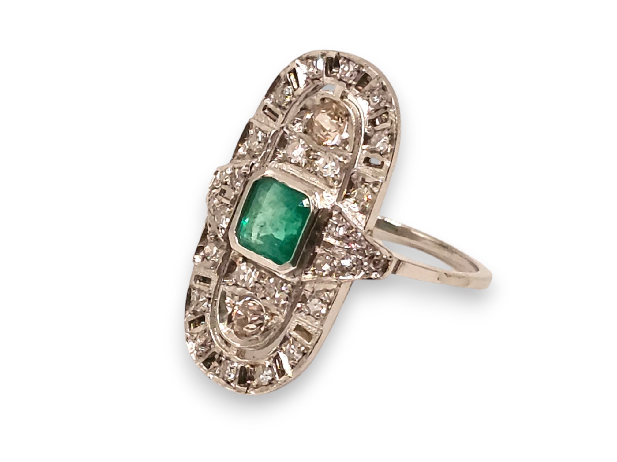 Anello in oro platino con smeraldo e diamanti, Anni '20