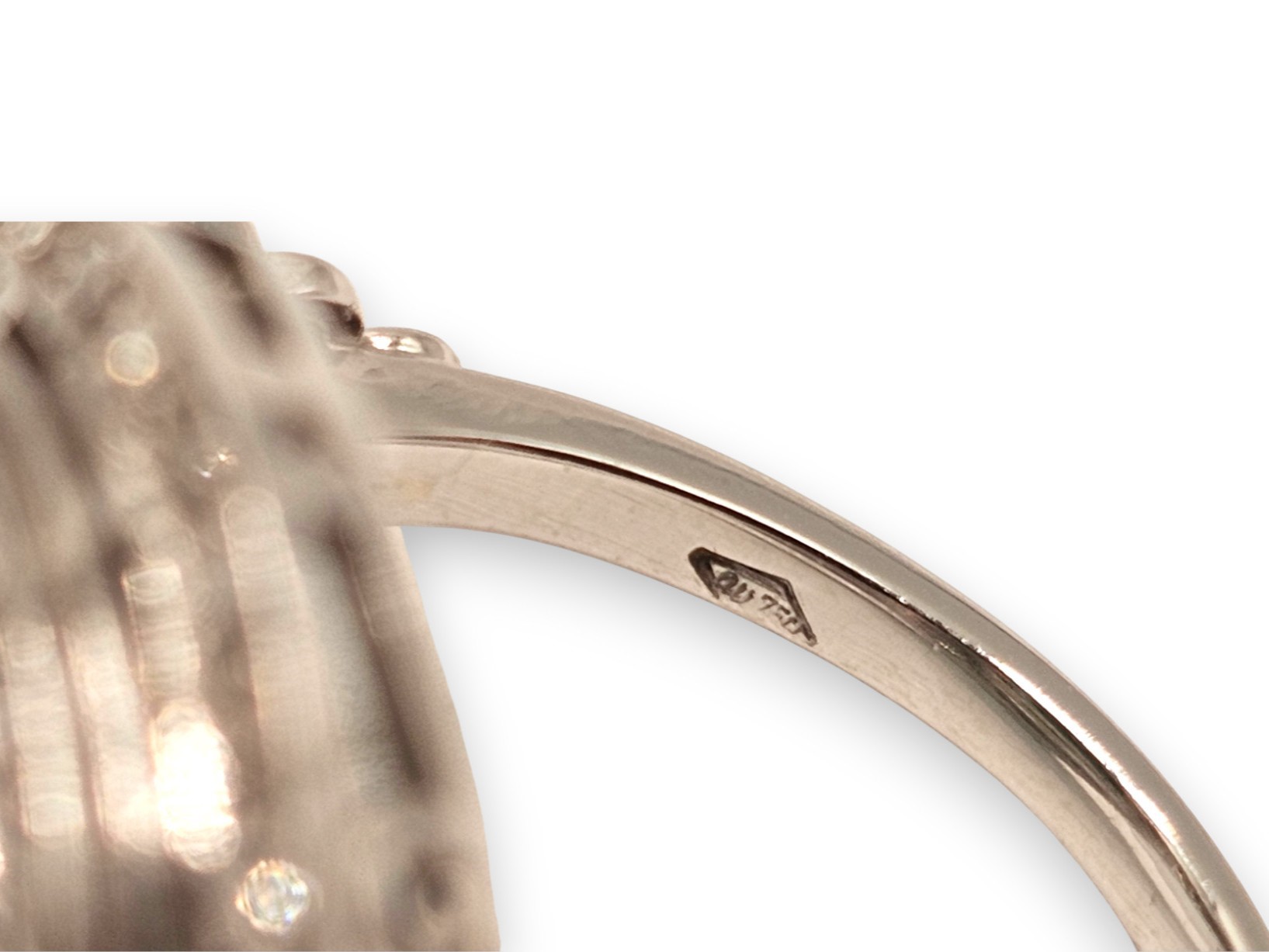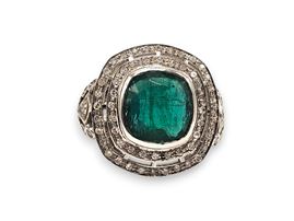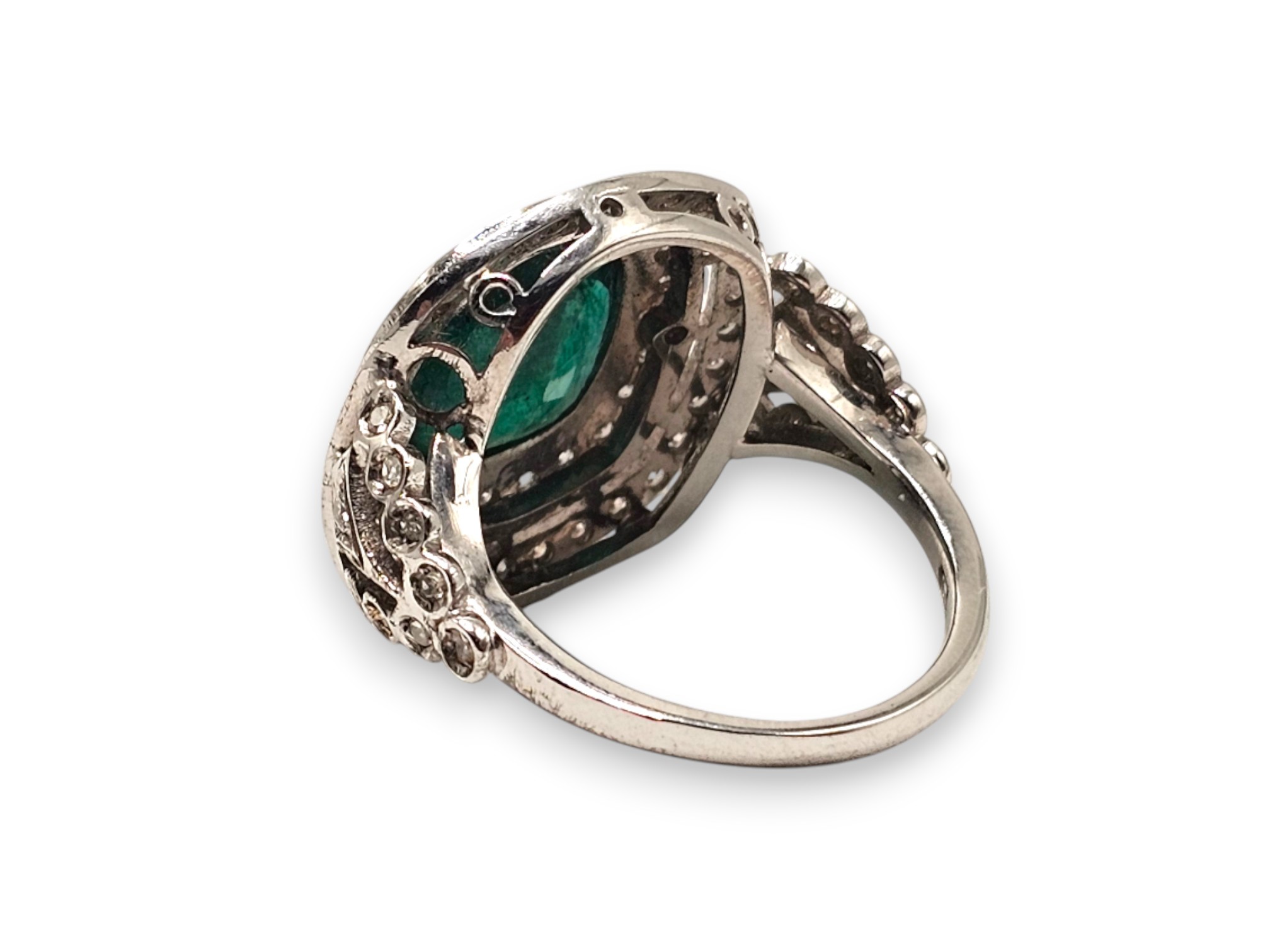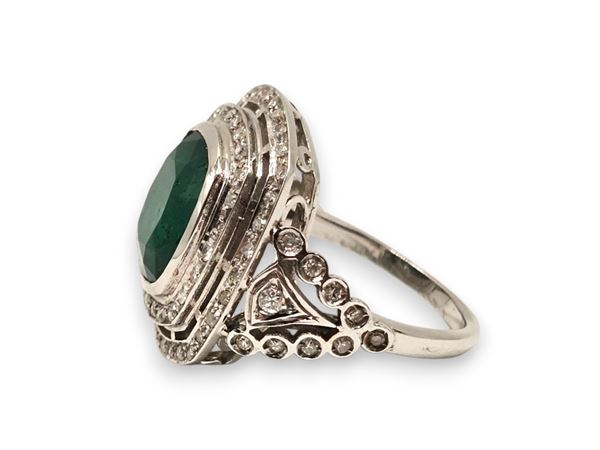in oro bianco 18k, modellato come una fascia, incastonato con smeraldo contornato da diamanti.