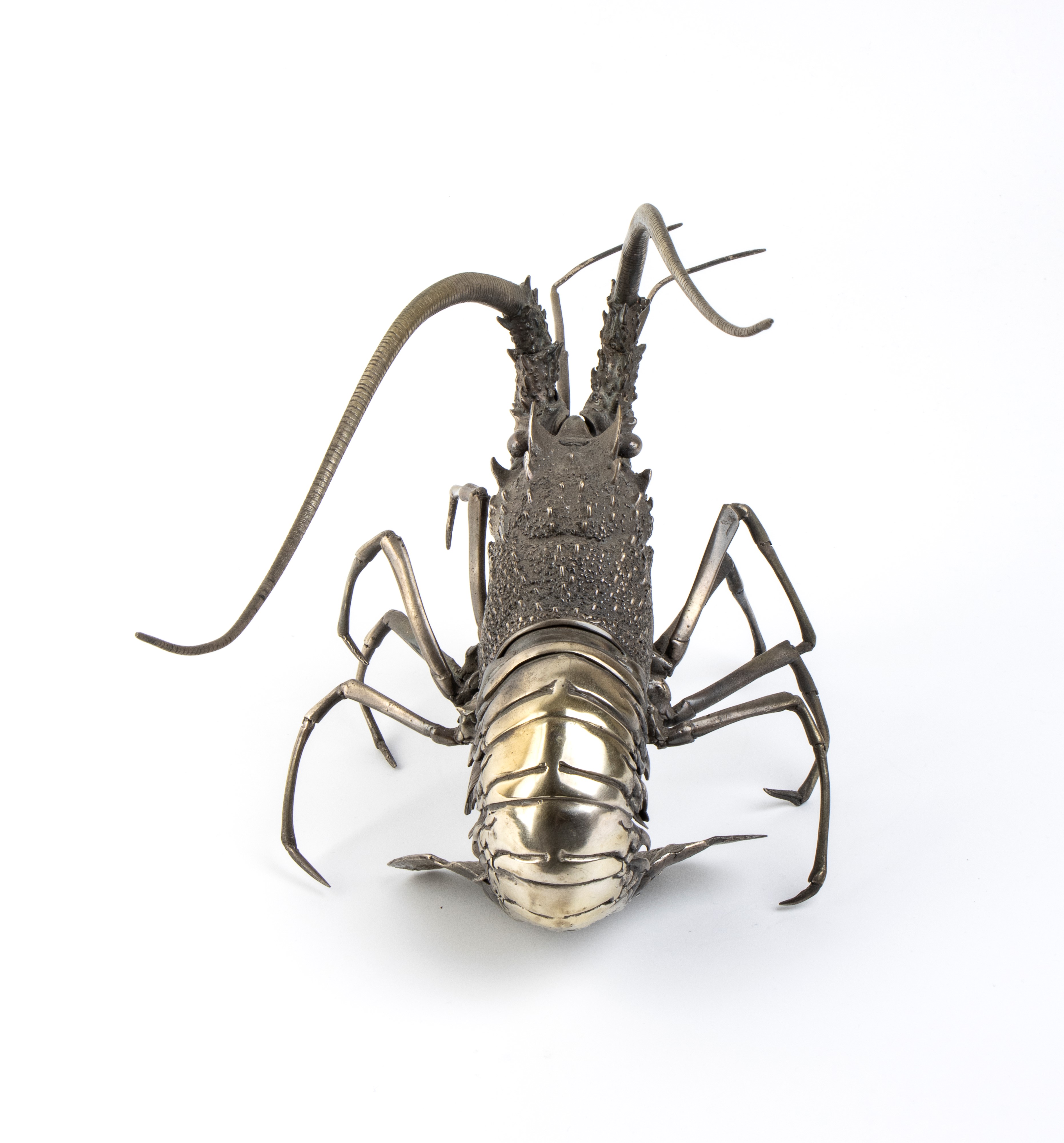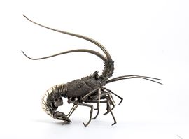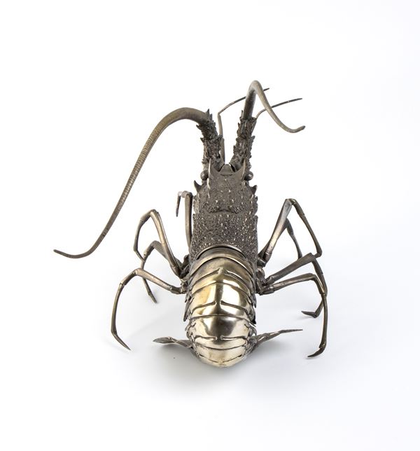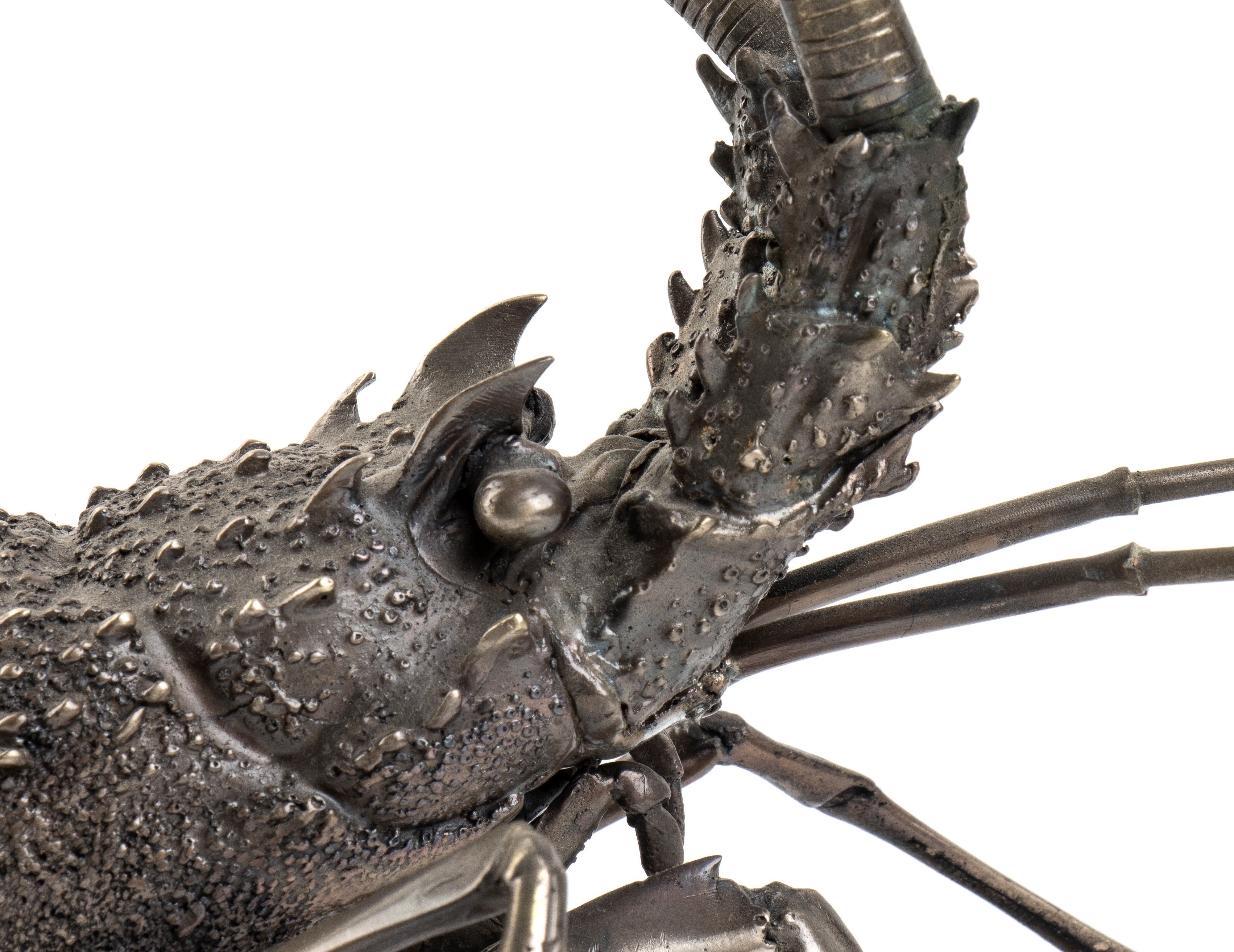 realizzata a fusione. La figura è caratterizzata da una resa molto fedele dei dettagli anatomici: il carapace è massiccio e brunito, con una superficie texturizzata che simula la corazza dell'animale. Le lunghe e sottili antenne sono realizzate in metallo lavorato a spirale o a segmenti. Le otto zampe e le chele sono articolate e proporzionate, conferendo all'aragosta una posa dinamica e realistica.