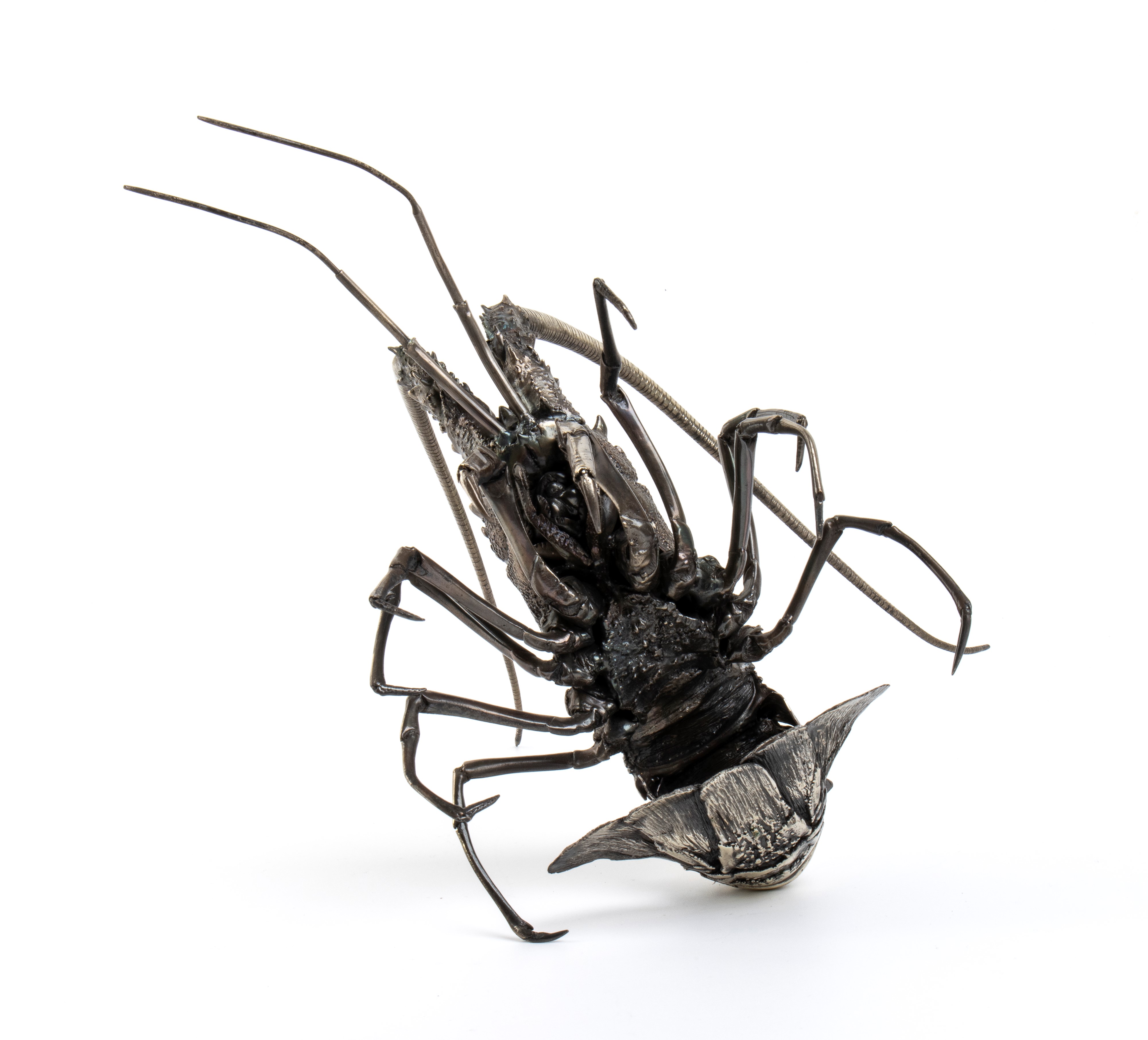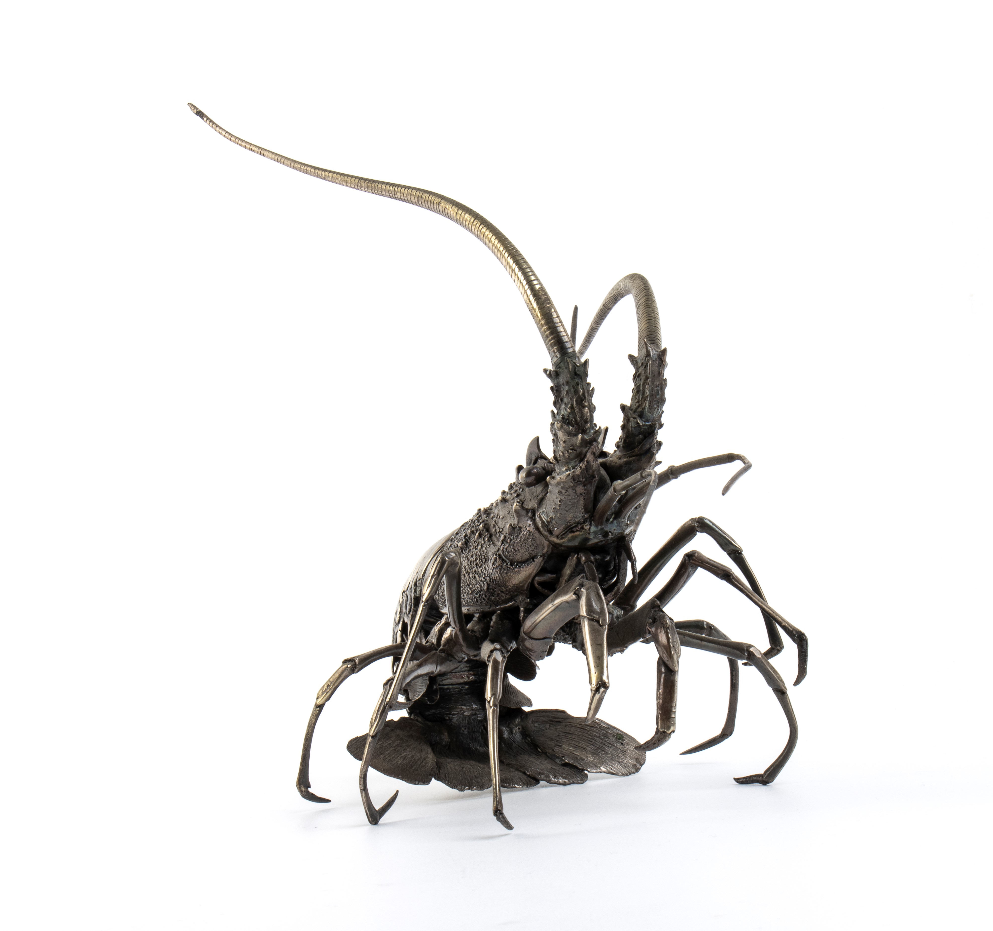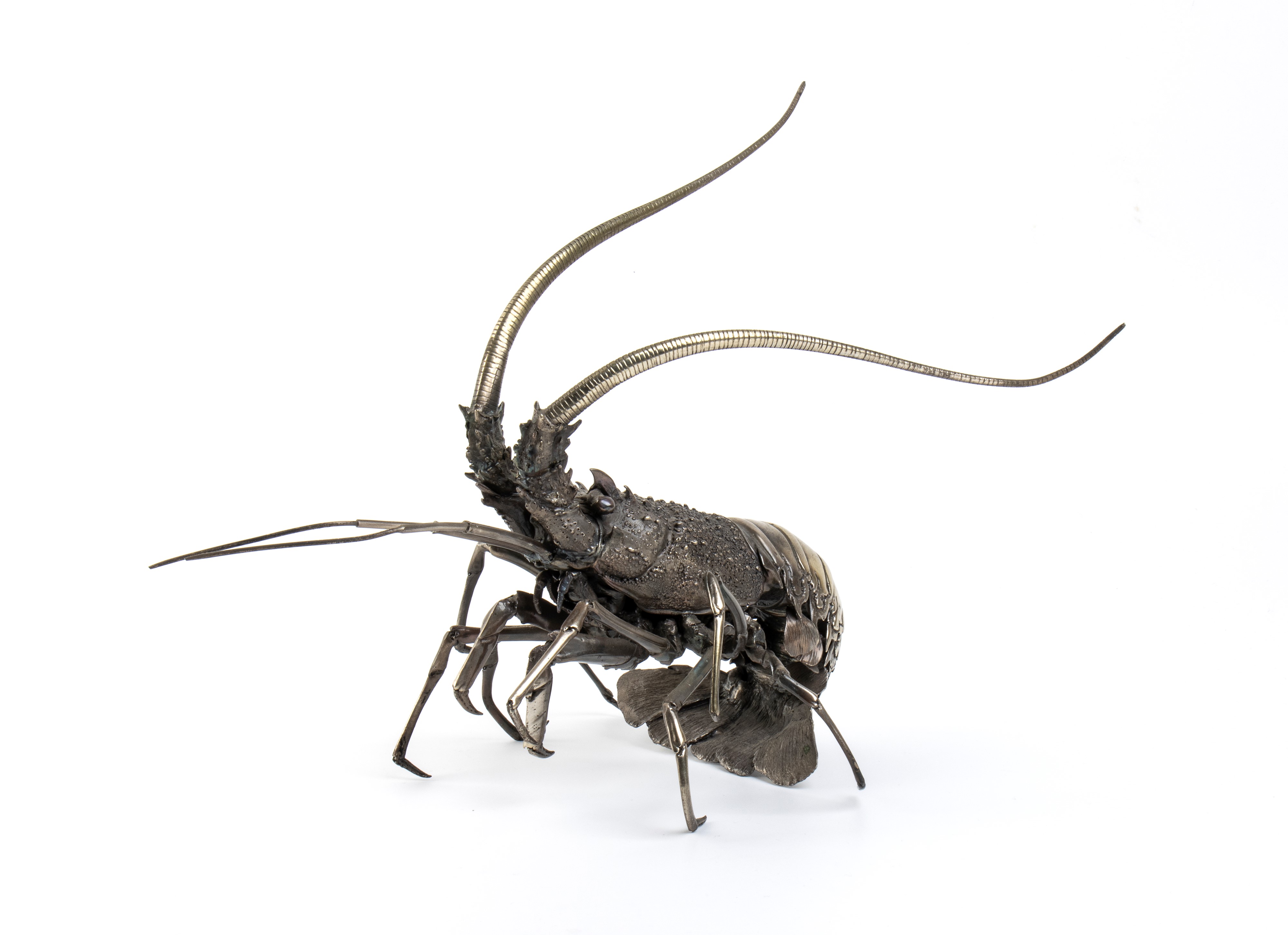 realizzata a fusione. La figura è caratterizzata da una resa molto fedele dei dettagli anatomici: il carapace è massiccio e brunito, con una superficie texturizzata che simula la corazza dell'animale. Le lunghe e sottili antenne sono realizzate in metallo lavorato a spirale o a segmenti. Le otto zampe e le chele sono articolate e proporzionate, conferendo all'aragosta una posa dinamica e realistica.