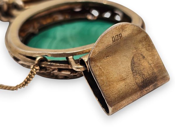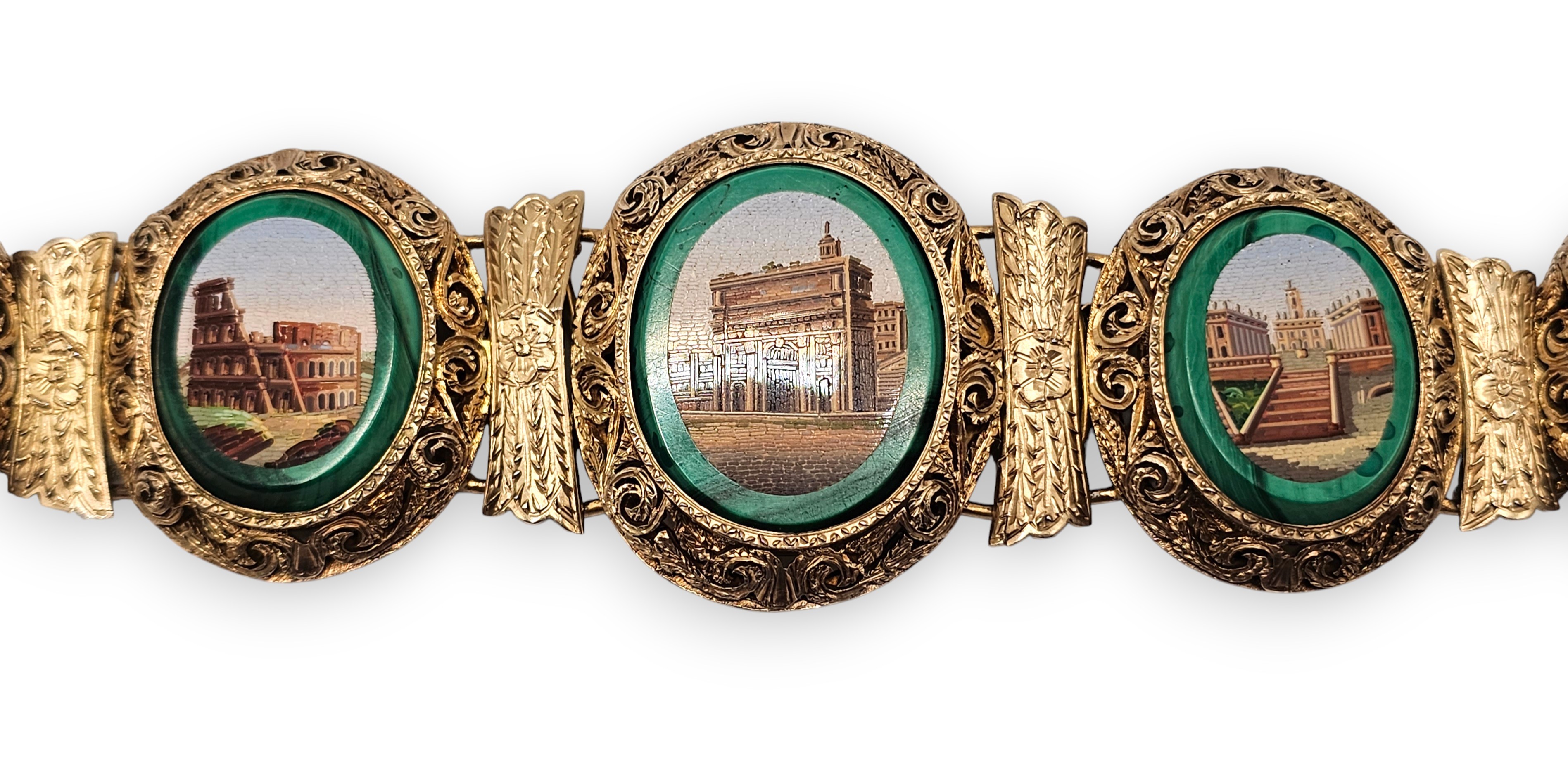 con 5 micromosaici raffiguranti monumenti della Roma classica e rinascimentale, maglie e castoni decorati incisi a motivi vegetali.