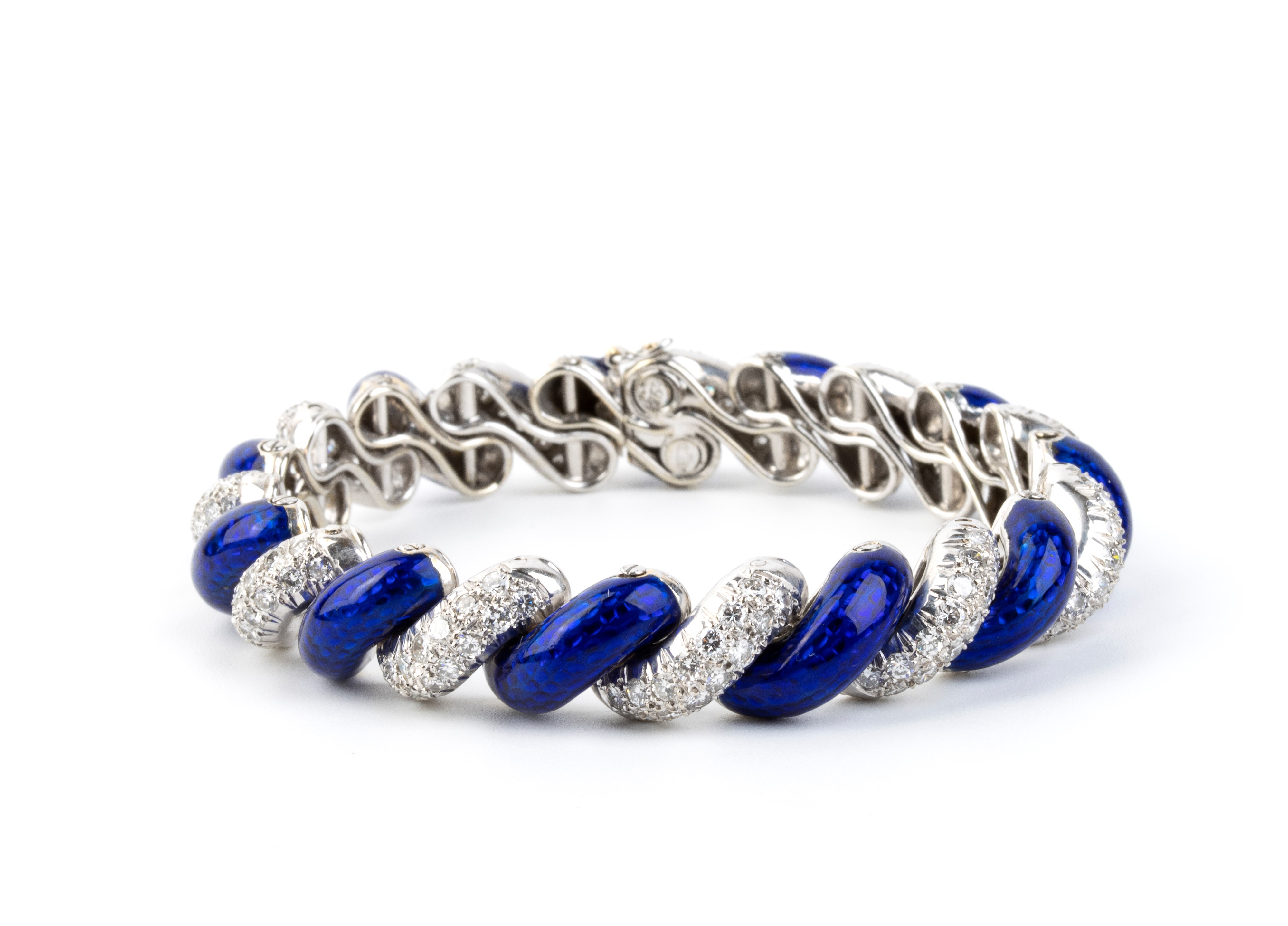 Bracciale e spilla in oro con smalto blu e diamanti