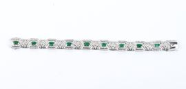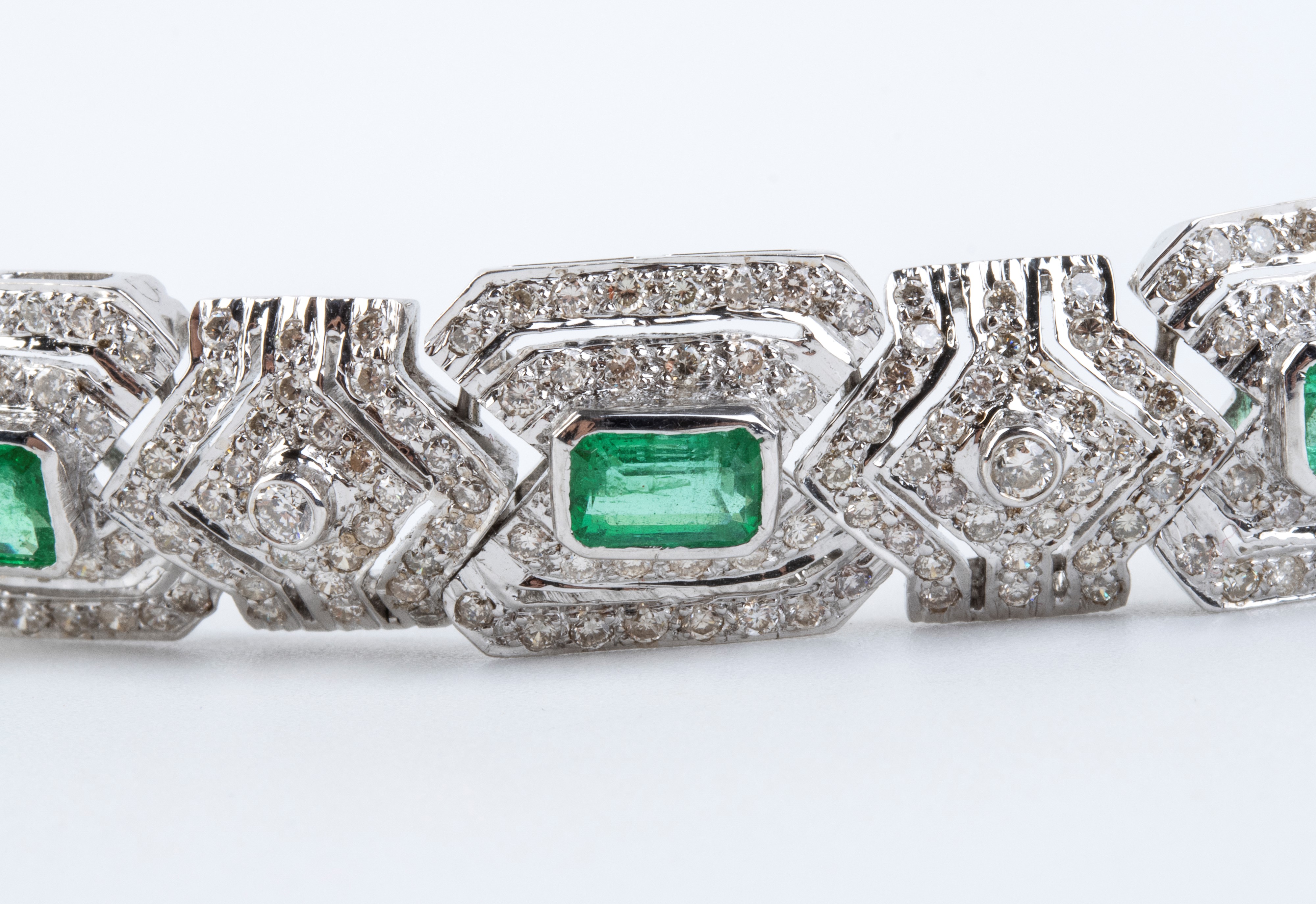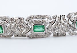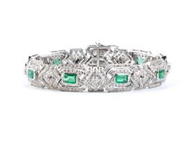 con linea di maglie geometriche incastonate con smeraldi e motivi di nastri in diamanti.