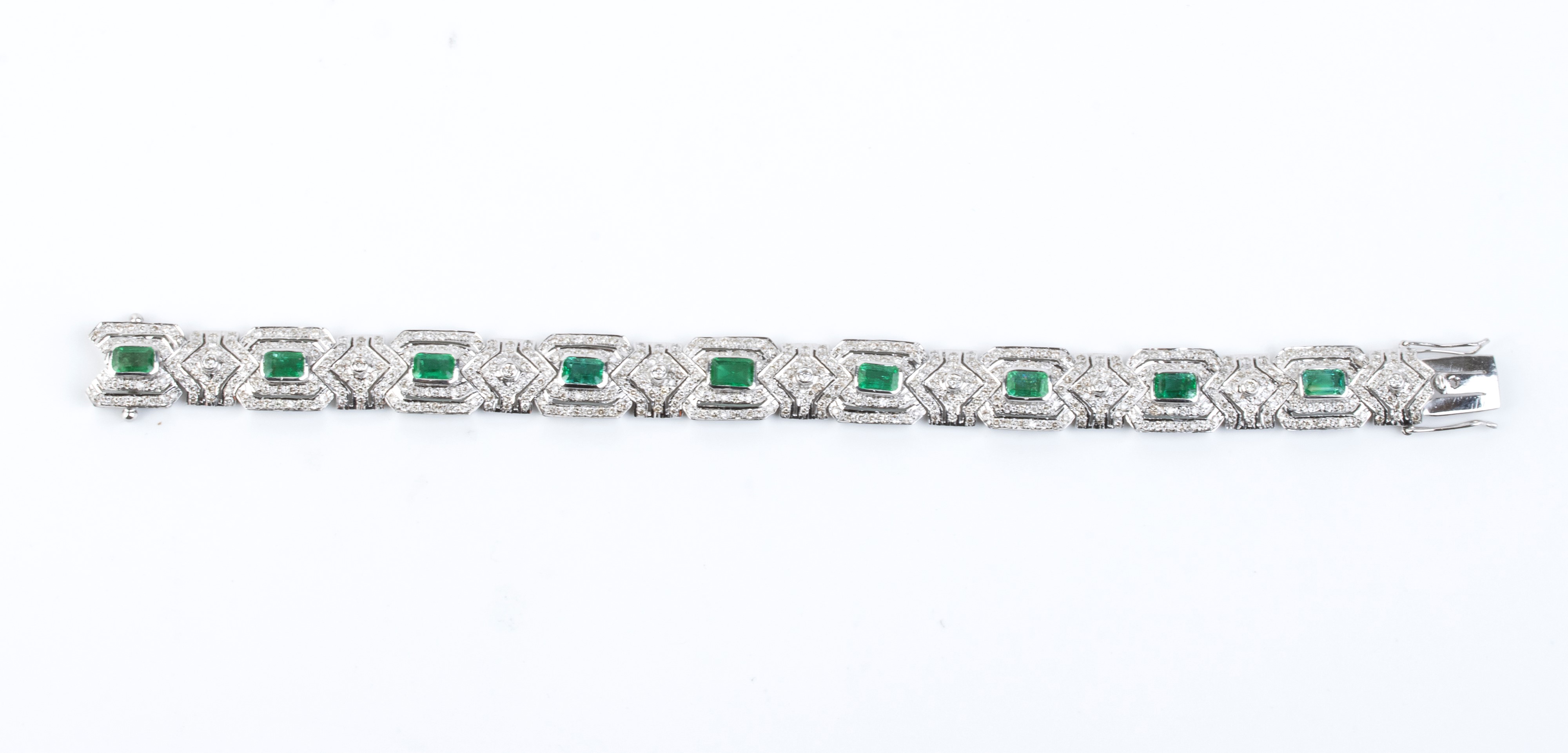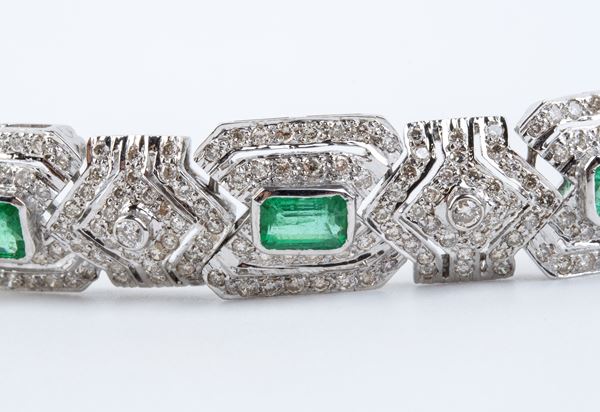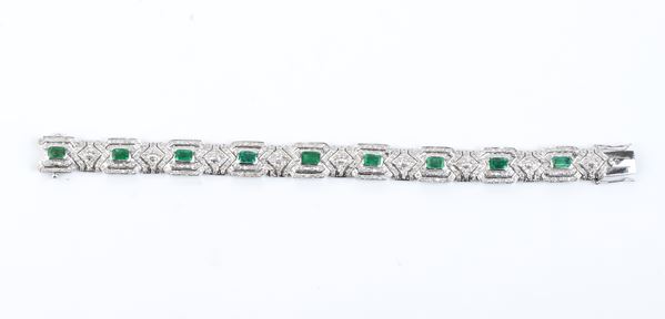 N. 549 diamanti taglio brillante stimati per un peso totale di circa 3.70 ct, colore J-K, purezza VS- SI e n. 09 smeraldi di forma ottagonale, per un peso totale di circa 7.50 ct.