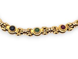 in oro giallo 18k, in linea di castoni con cabochon di zaffiri, rubini e smeraldi.