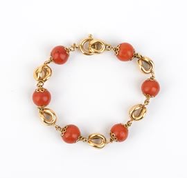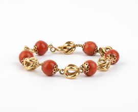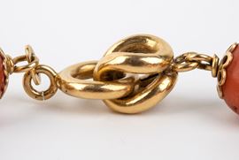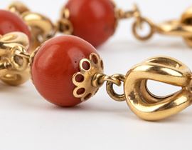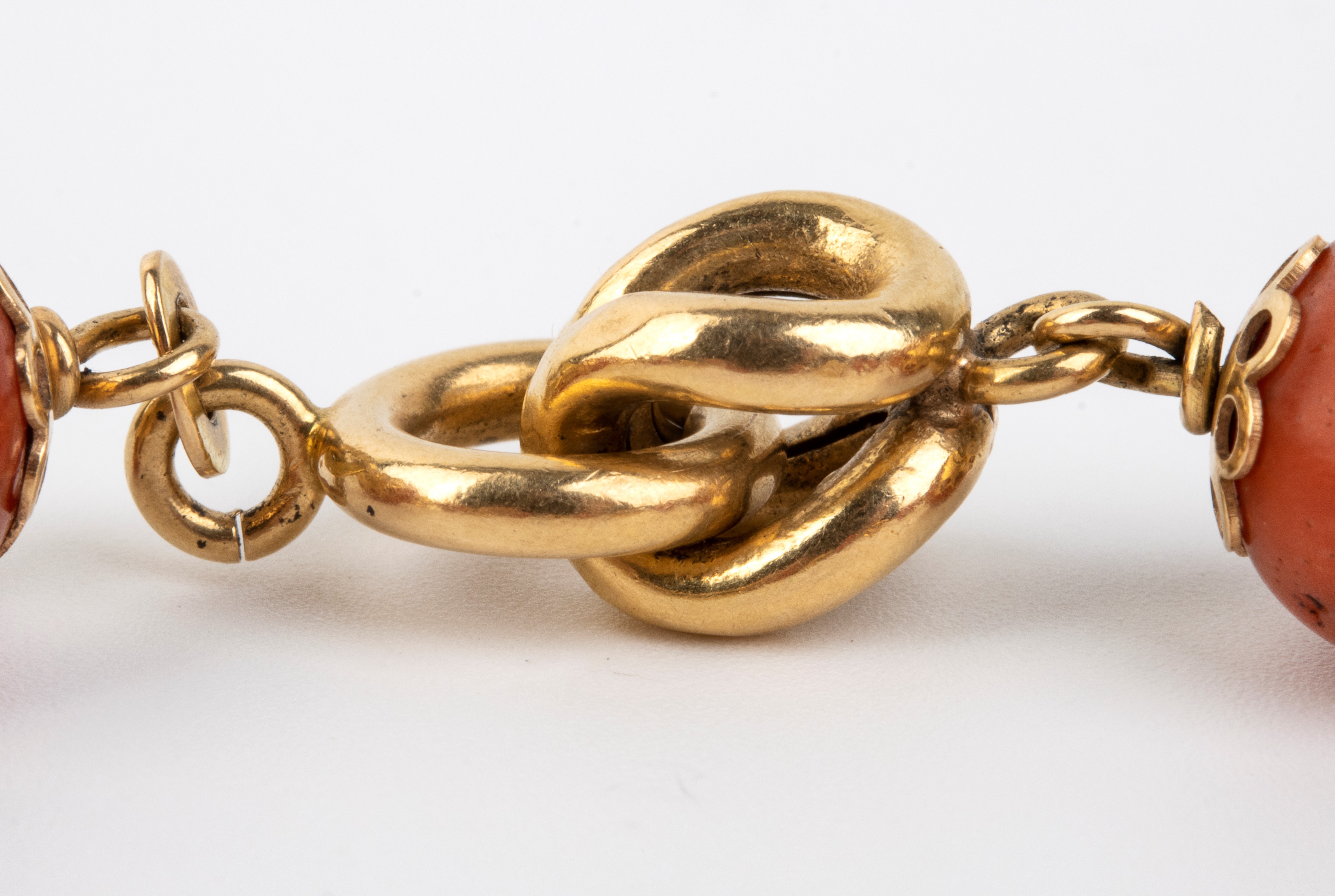con catena a maglie fantasia in oro giallo 18k interrotta da sfere di corallo Mediterraneo (Corallium Rubrum).