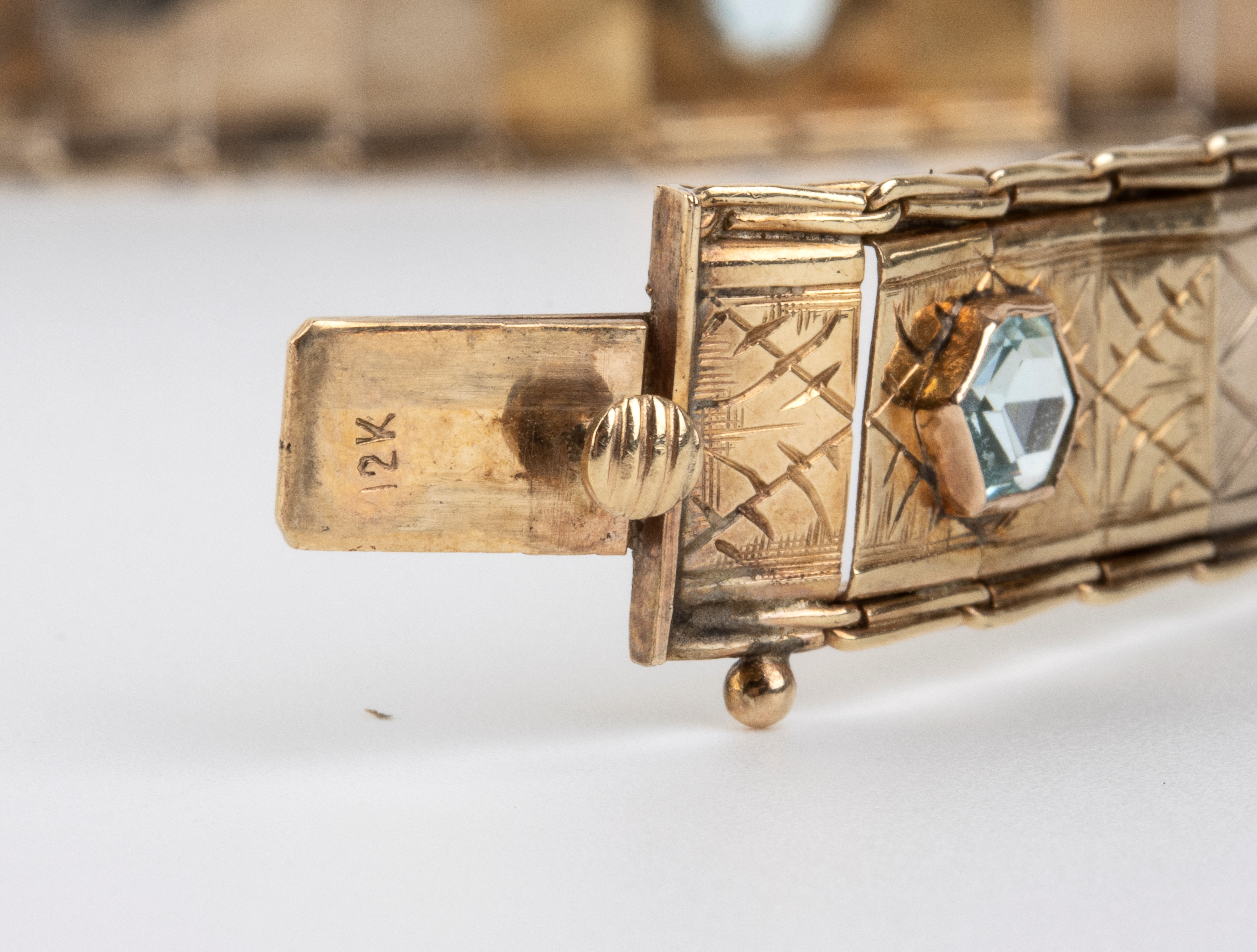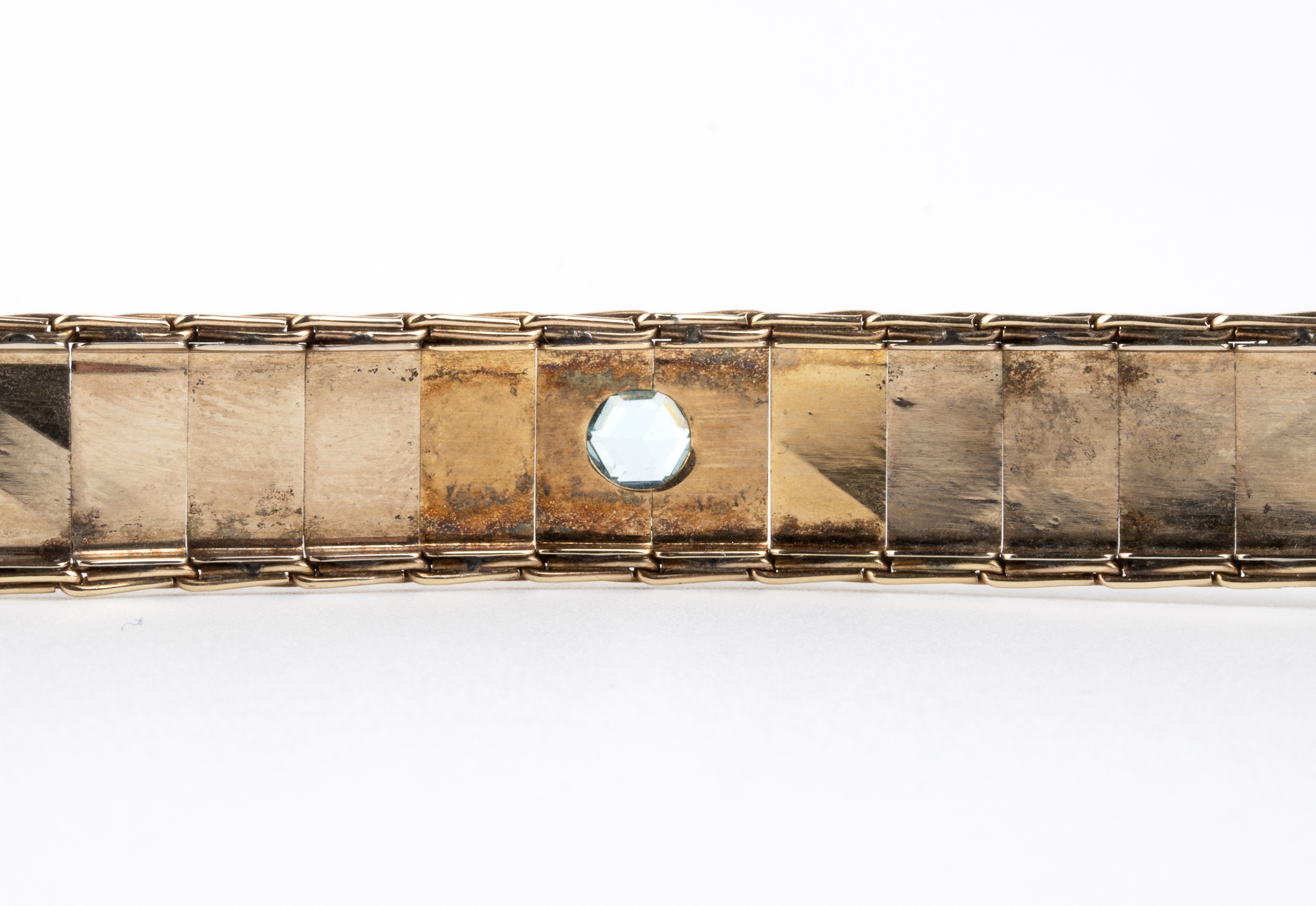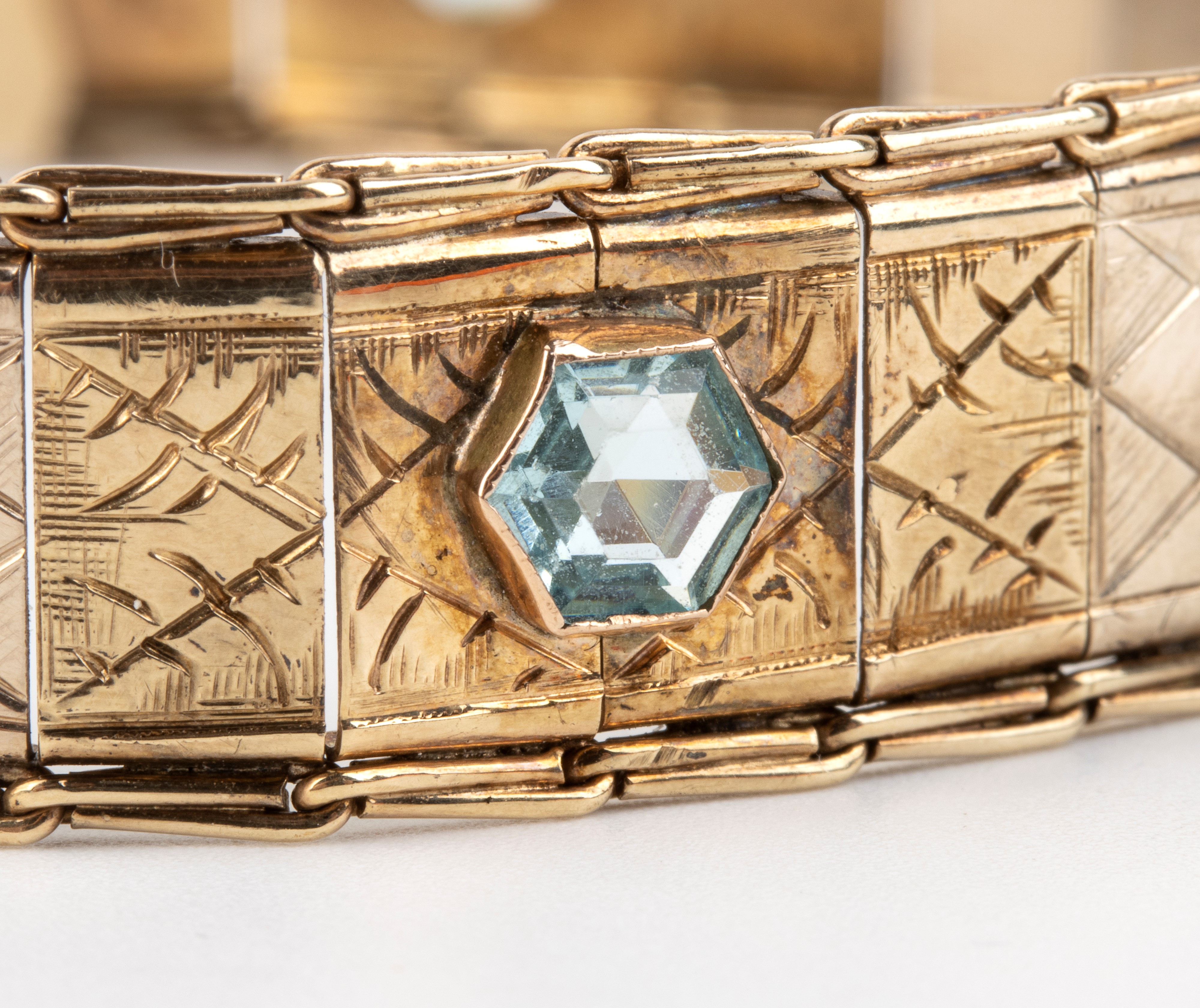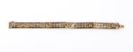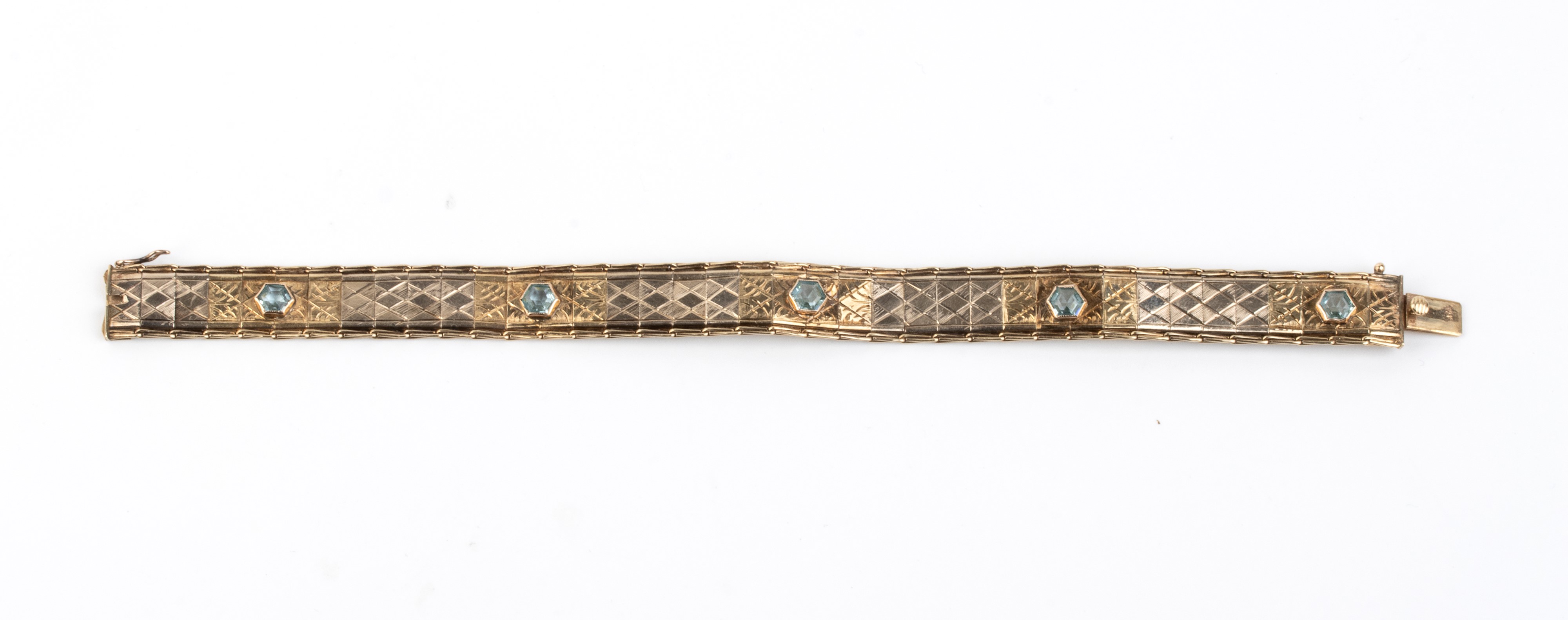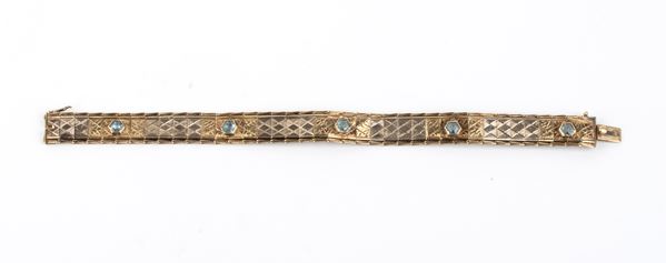 in oro giallo 12k, in linea di maglie geometriche incise, incastonato con n. 05 paste vitree.