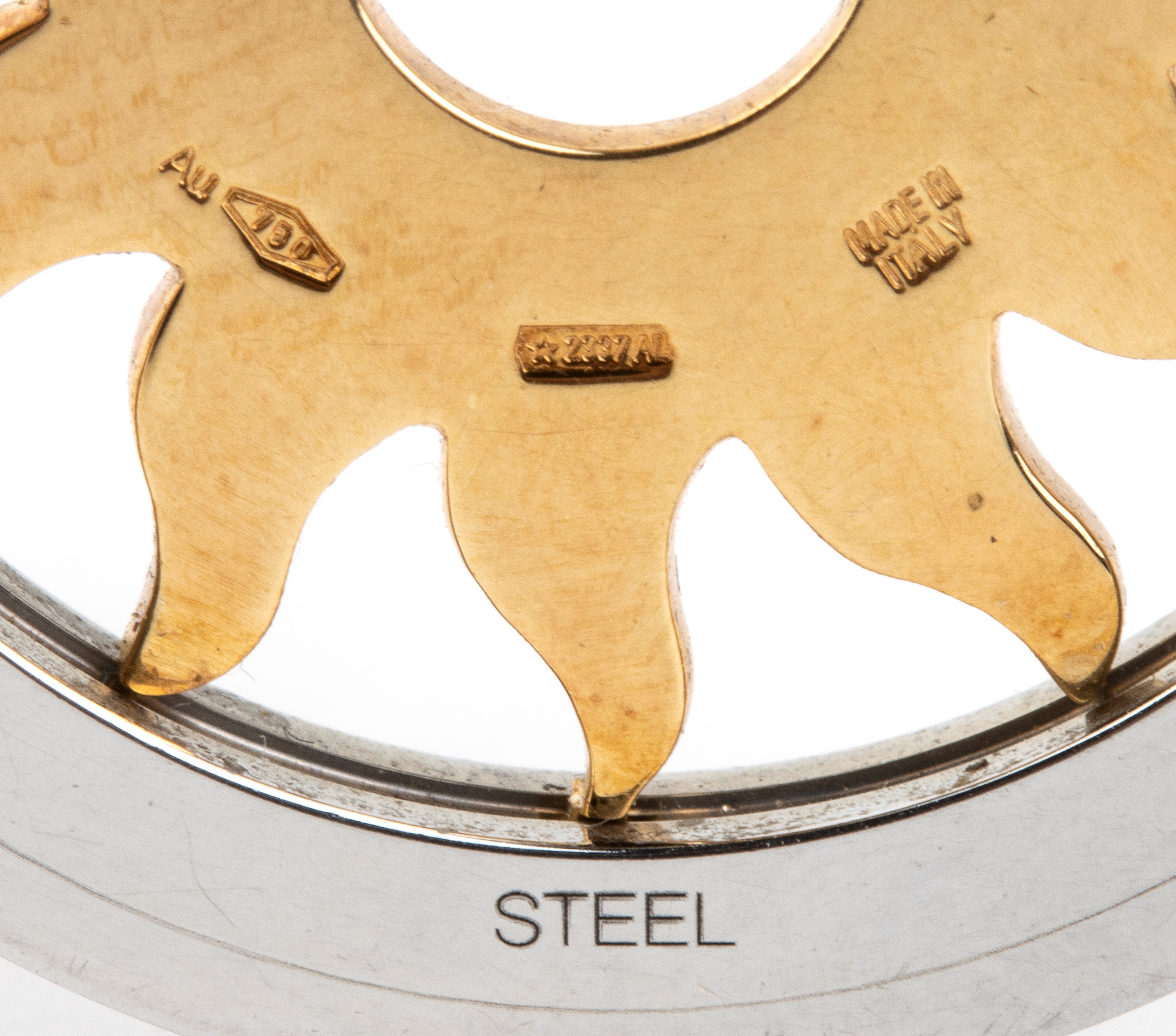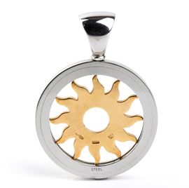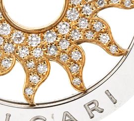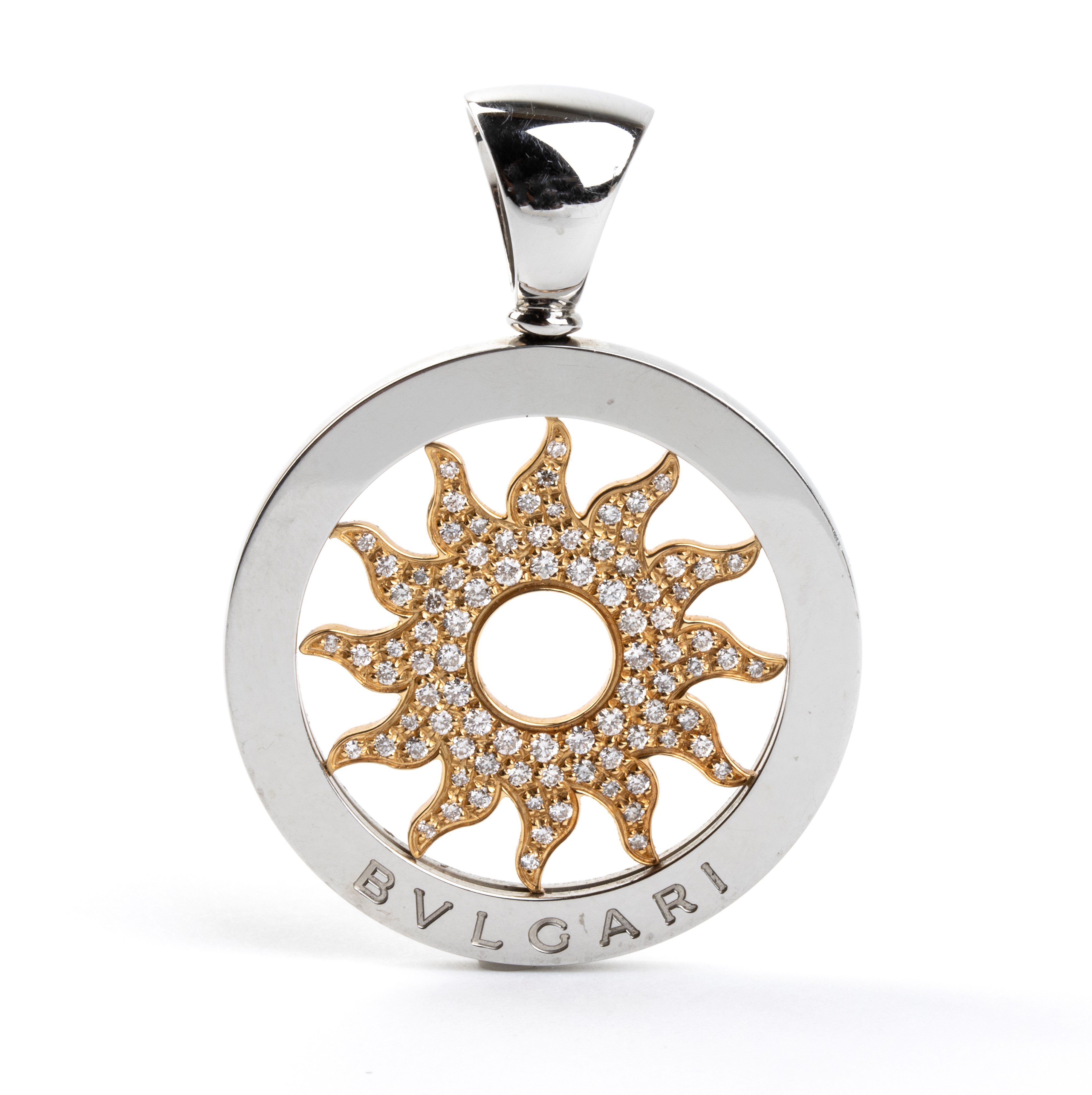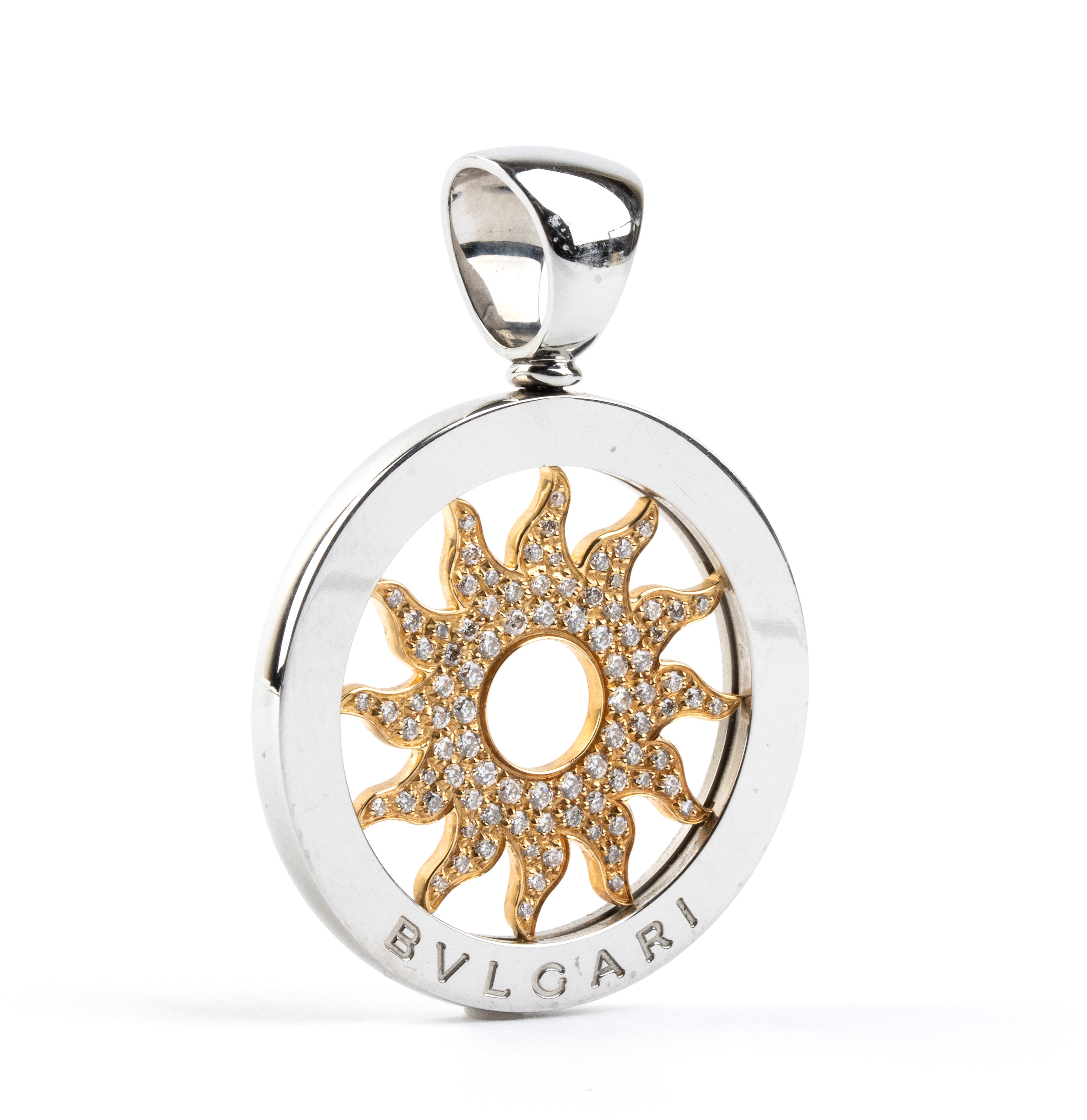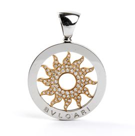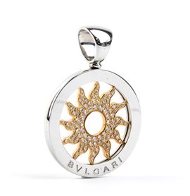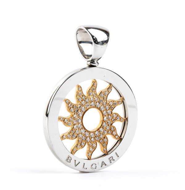 pendente raffigurante un sole in oro giallo 18k e pavé di diamanti, con cornice in acciaio. Firmato "BVLGARI".