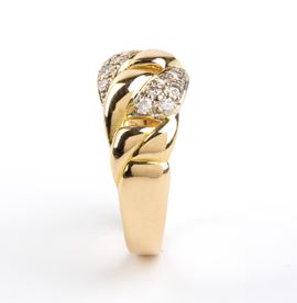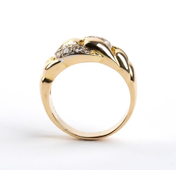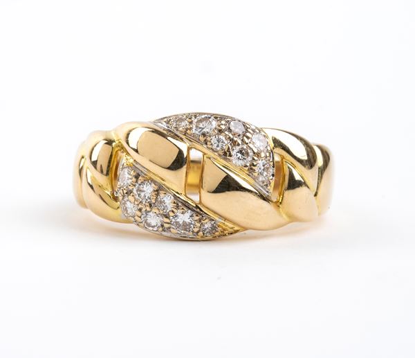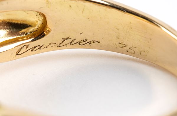 in oro giallo 18k, con motivo di nastri in diamanti taglio brillante, stimati per un peso totale di circa 0.45 ct, colore G-K purezza VS-SI. Firmato "CARTIER".