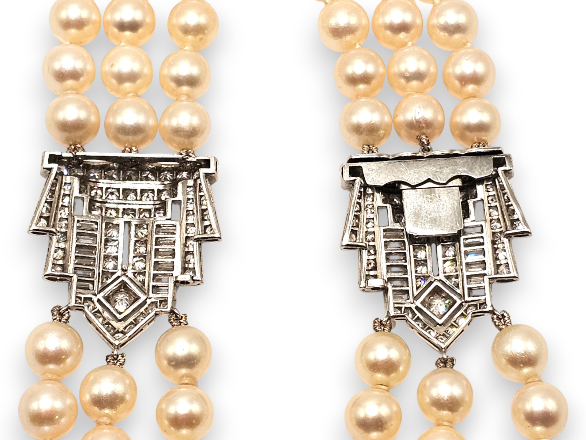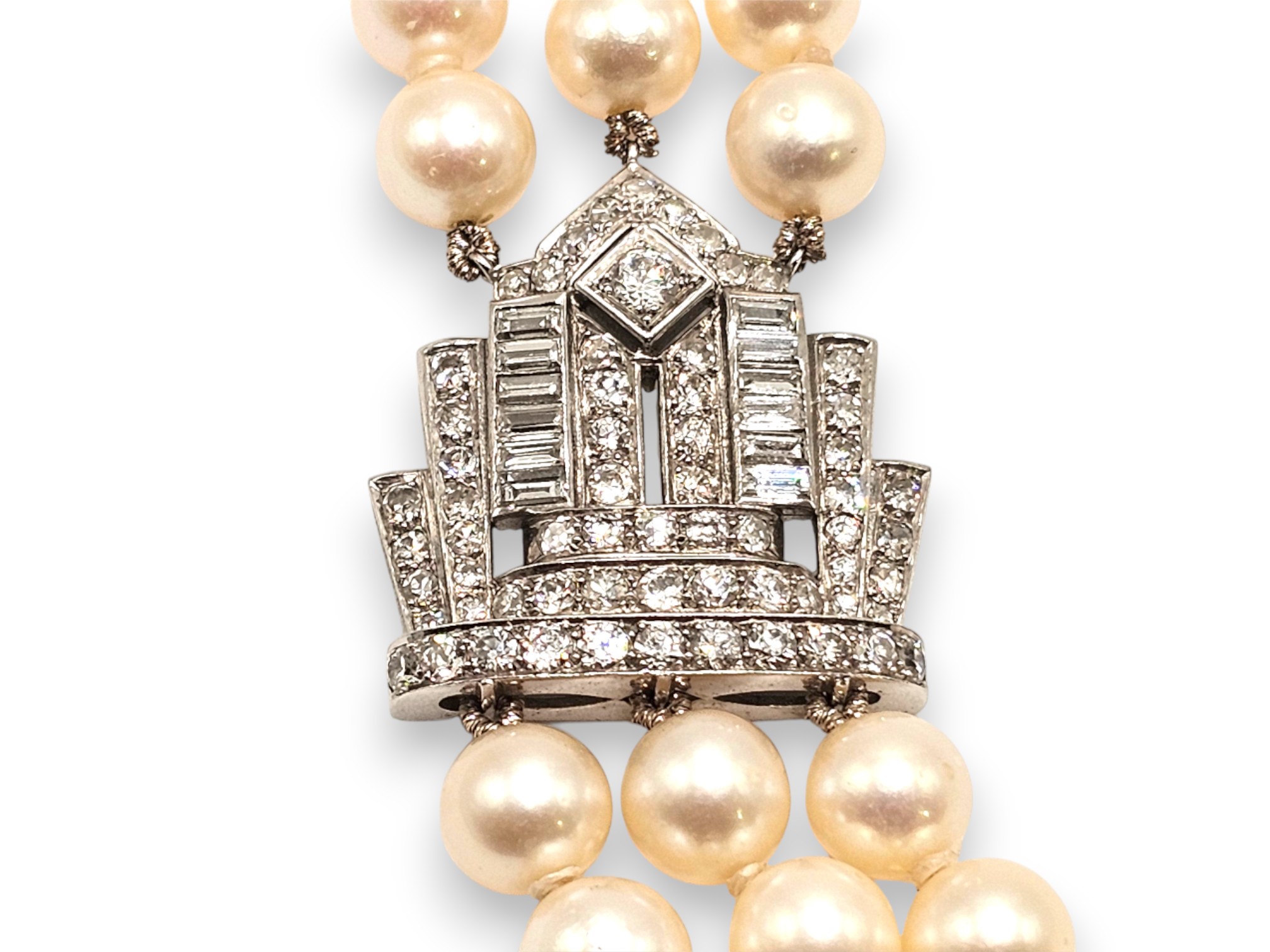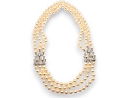 a tre fili di perle coltivate d'acqua salata, con una distintiva chiusura e clip laterale in platino di uguale fattura, decorate con diamanti taglio a baguette e a brillante. La chiusura e la clip presentano un disegno a "corona" che conferisce alla collana stessa un aspetto elegante ed importante.